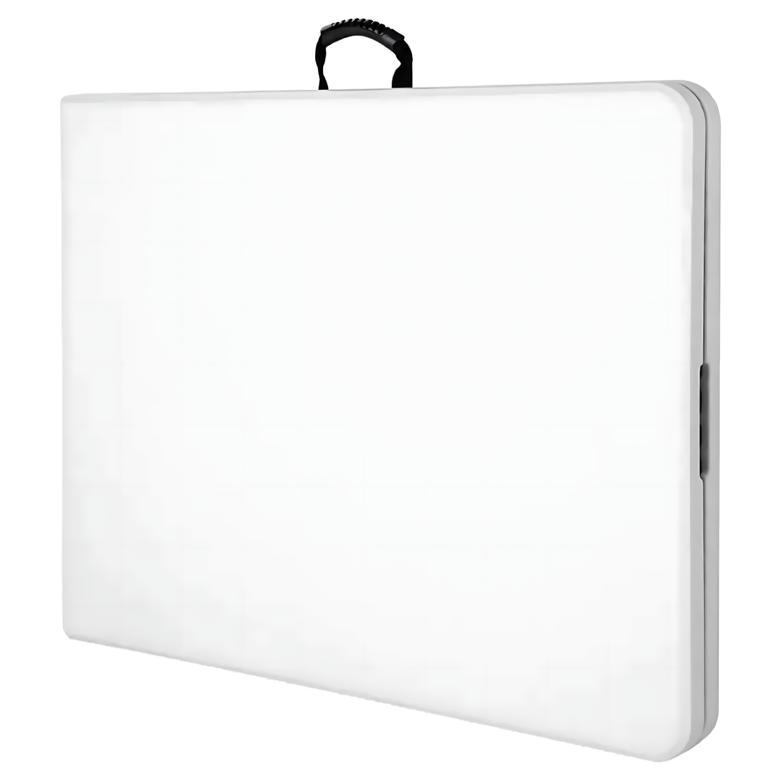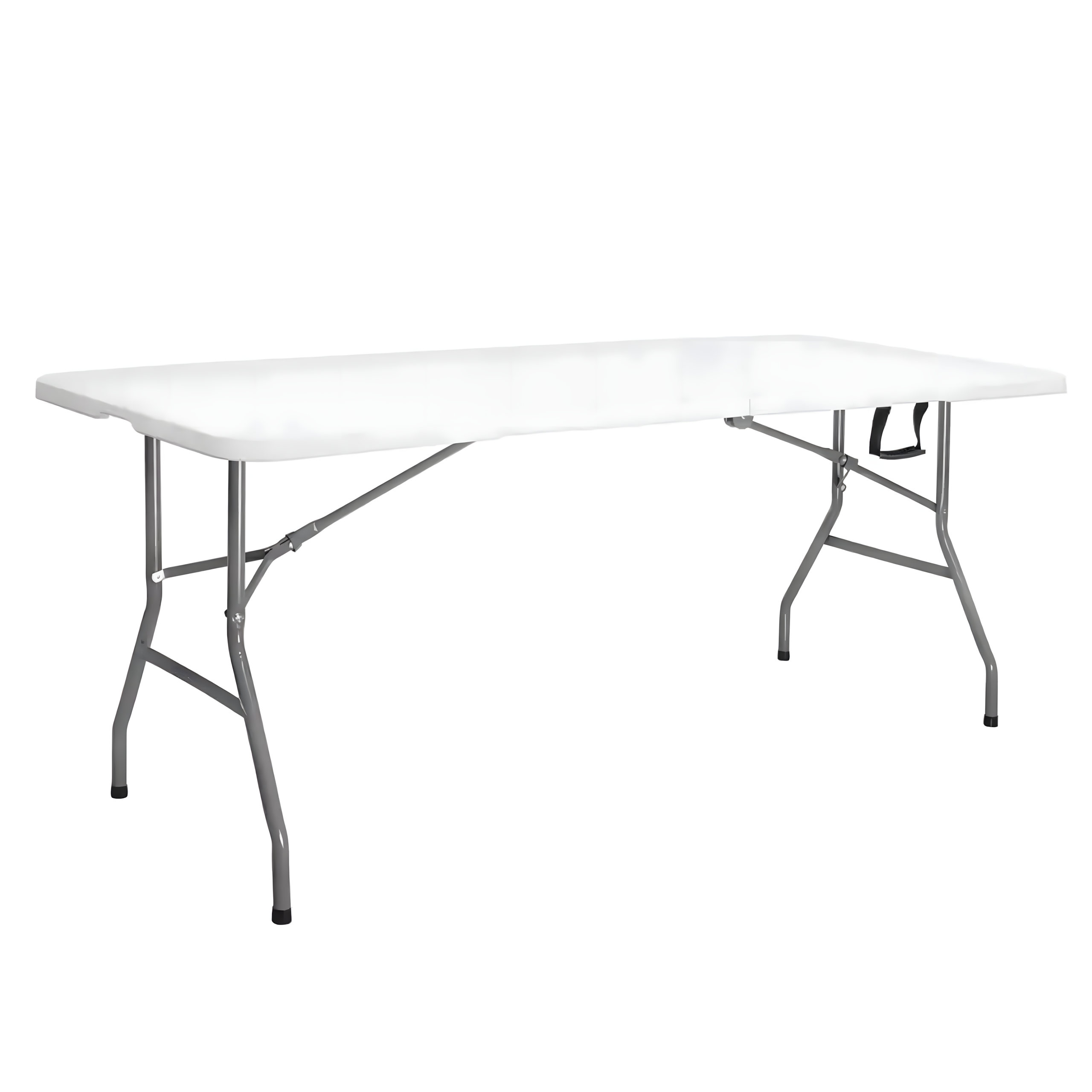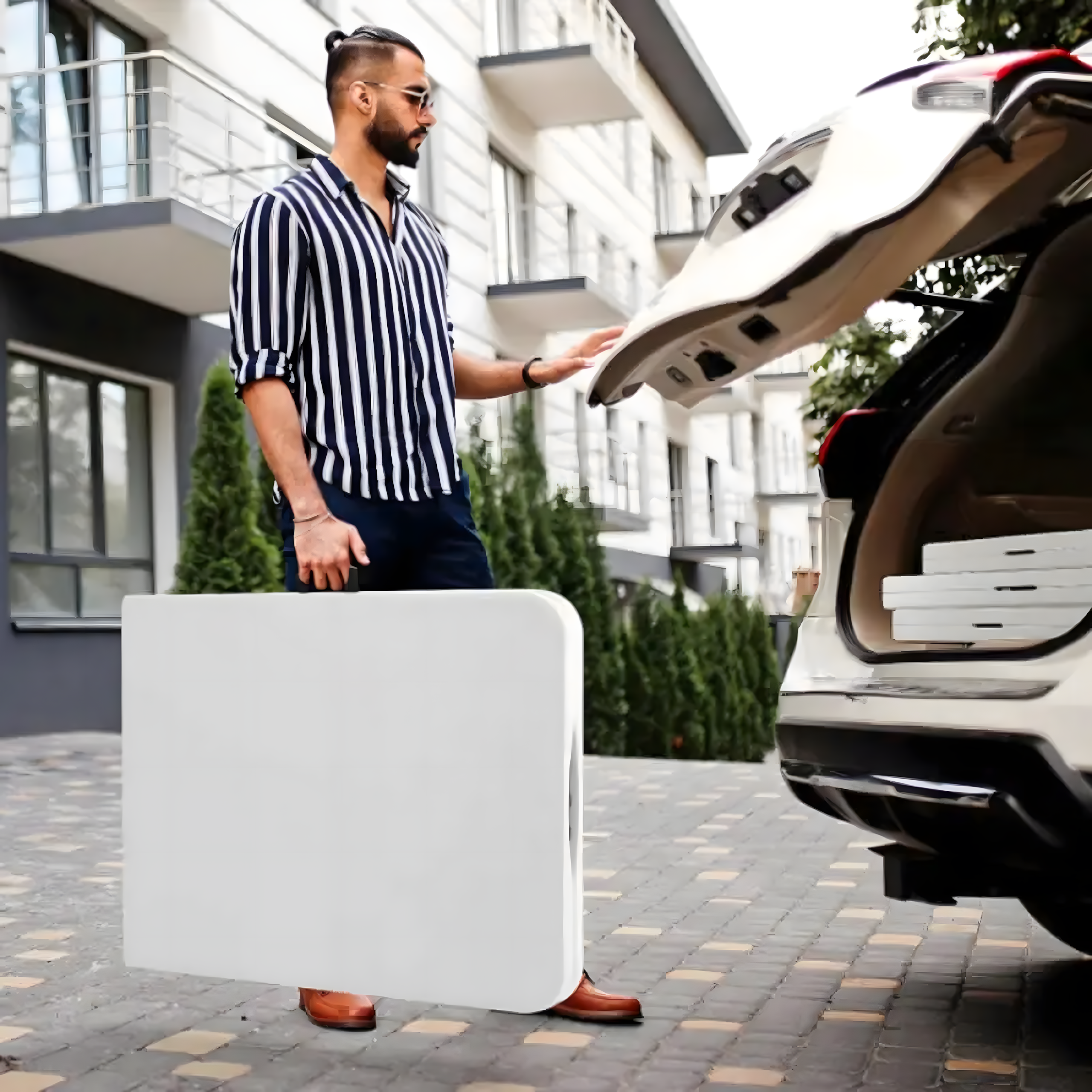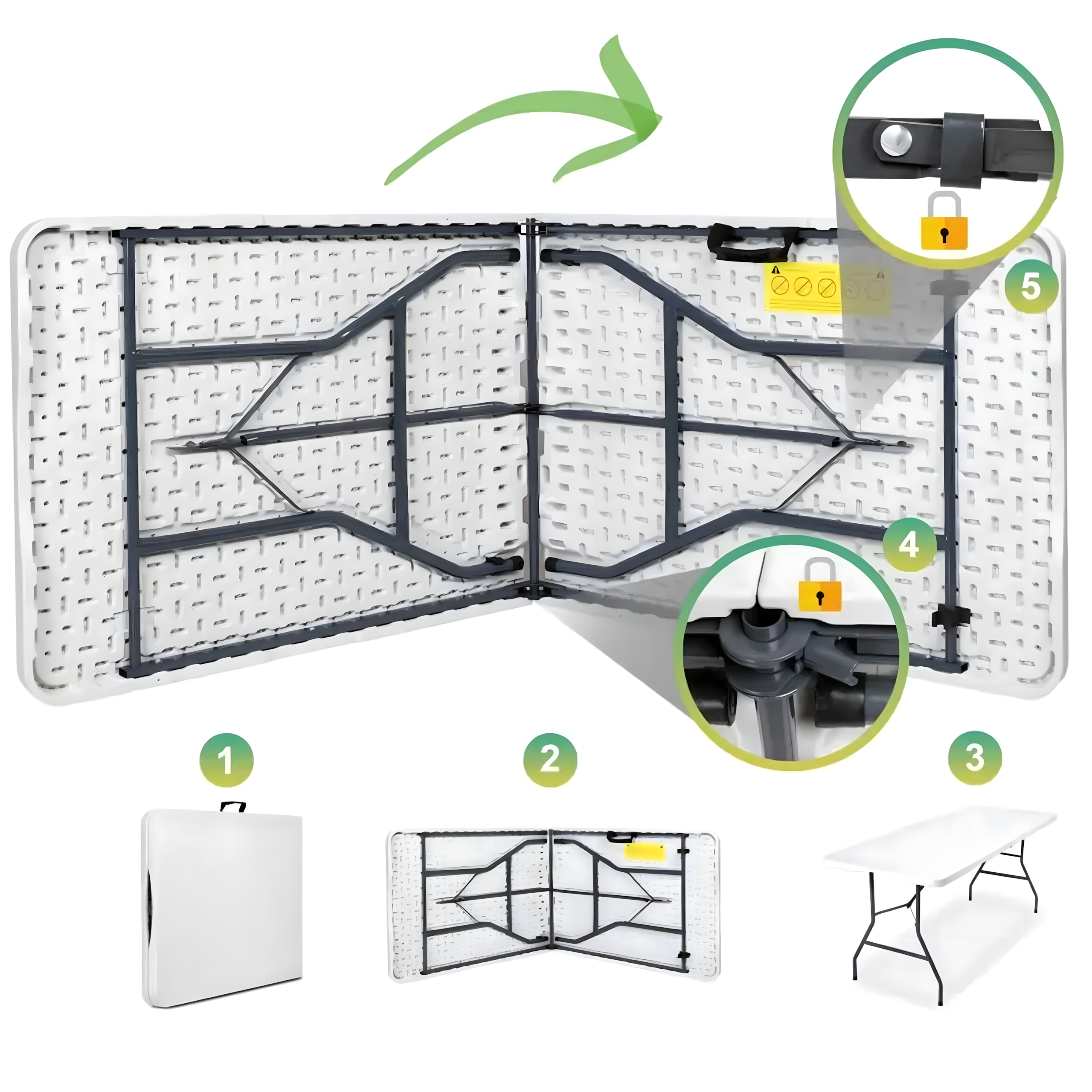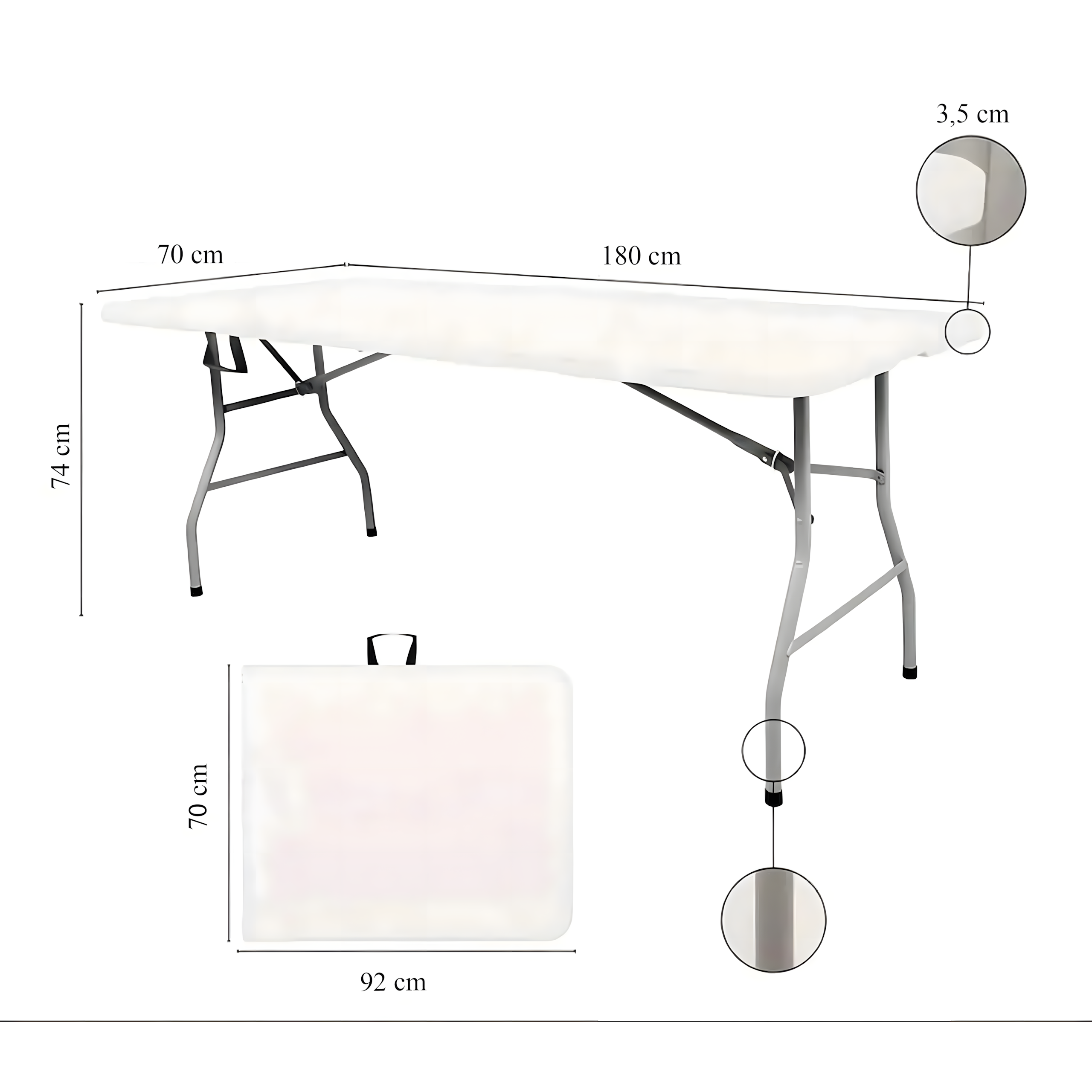 Biały stół składany 180 x 70 x 74 cm jest duży i stabilny. Jego blat wykonano z twardego tworzywa sztucznego, co ułatwia pielęgnację. Składane pod blat nogi są stalowe i mają zabezpieczenie przed złożeniem pod ciężarem jedzenia i napojów. Gdy go nie używasz lub chcesz przewieźć, zamieni się w stół-walizkę. W tej sprytnej konstrukcji nogi modelu ukryte są wewnątrz. Uchwyt pomoże natomiast w komfortowym przenoszeniu.