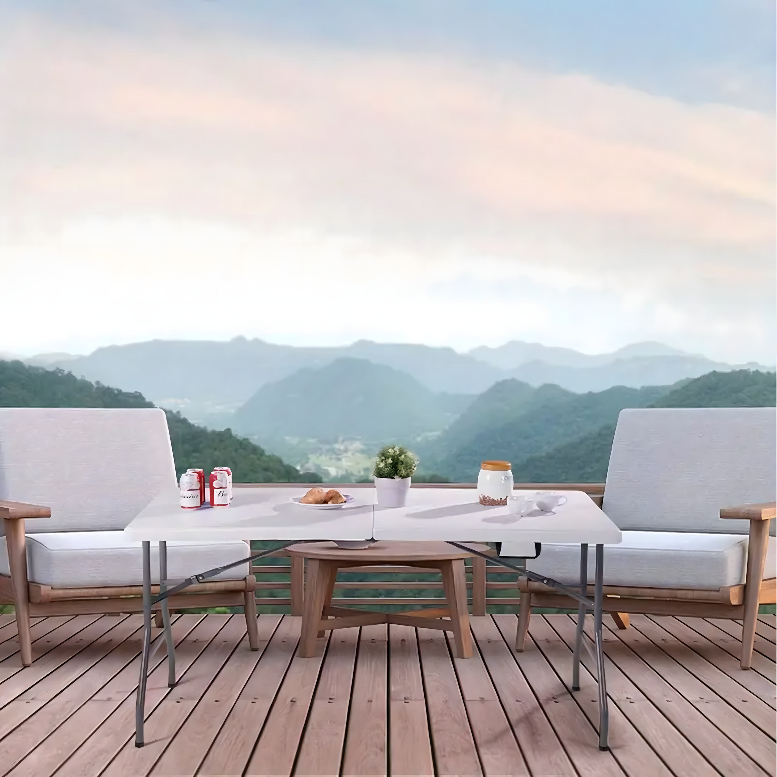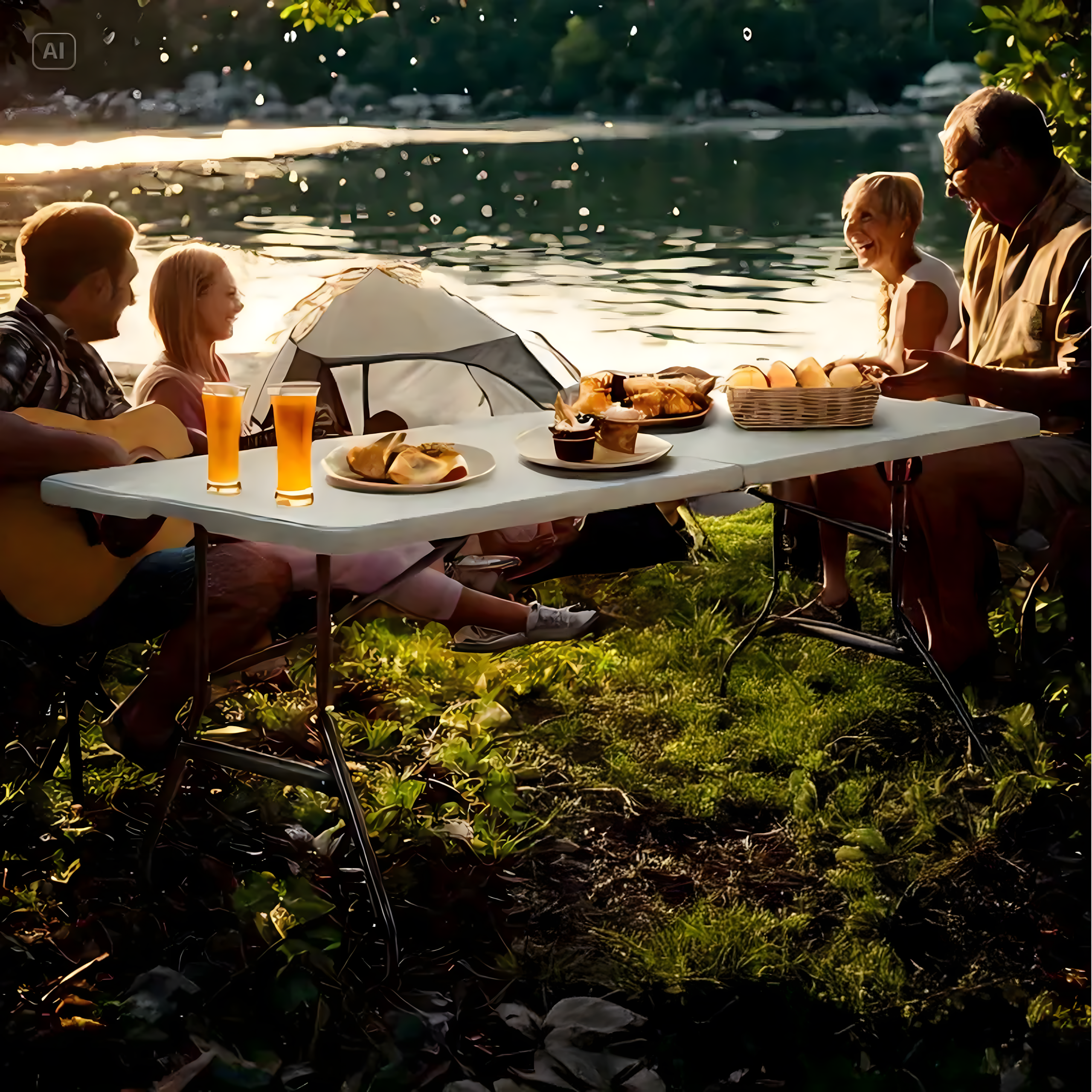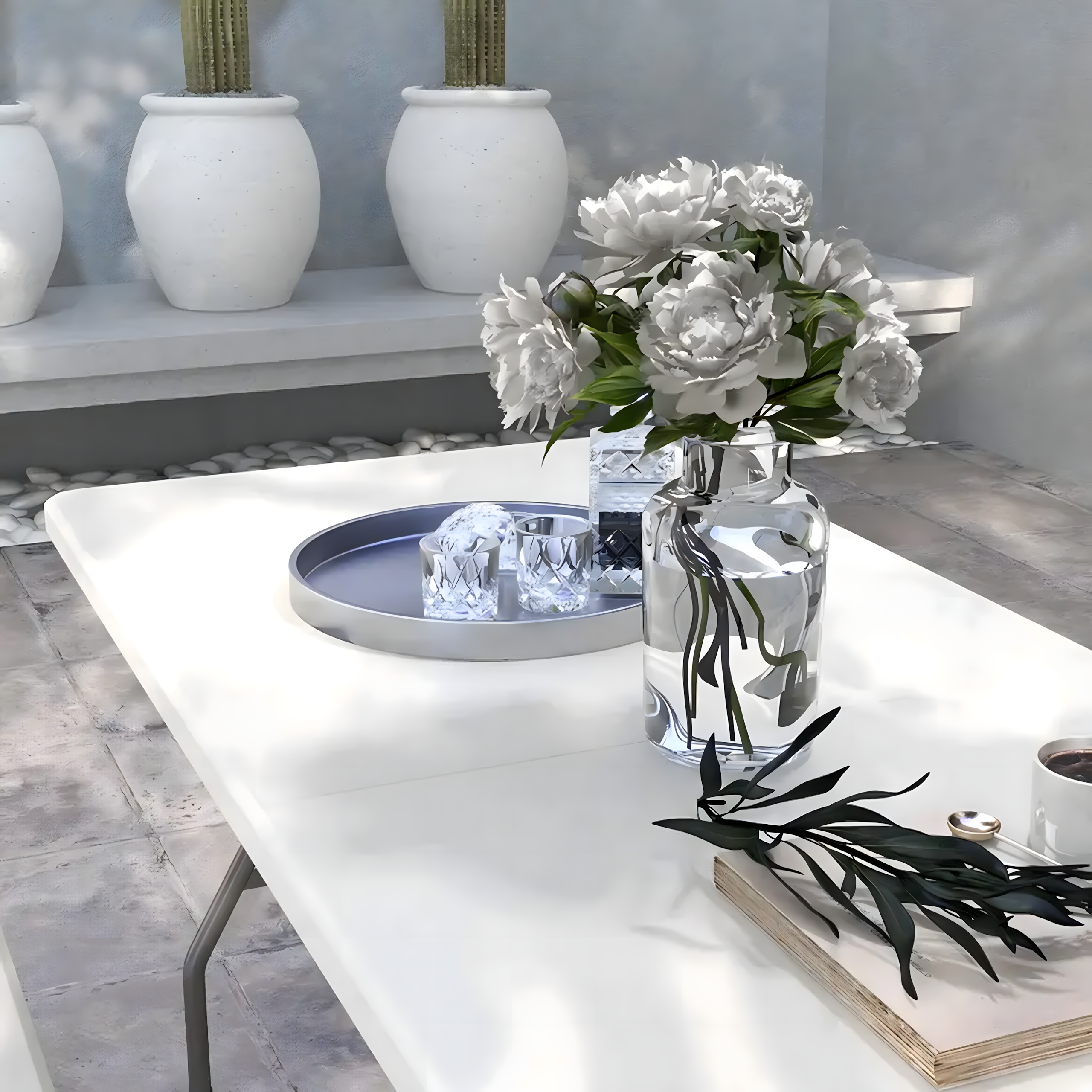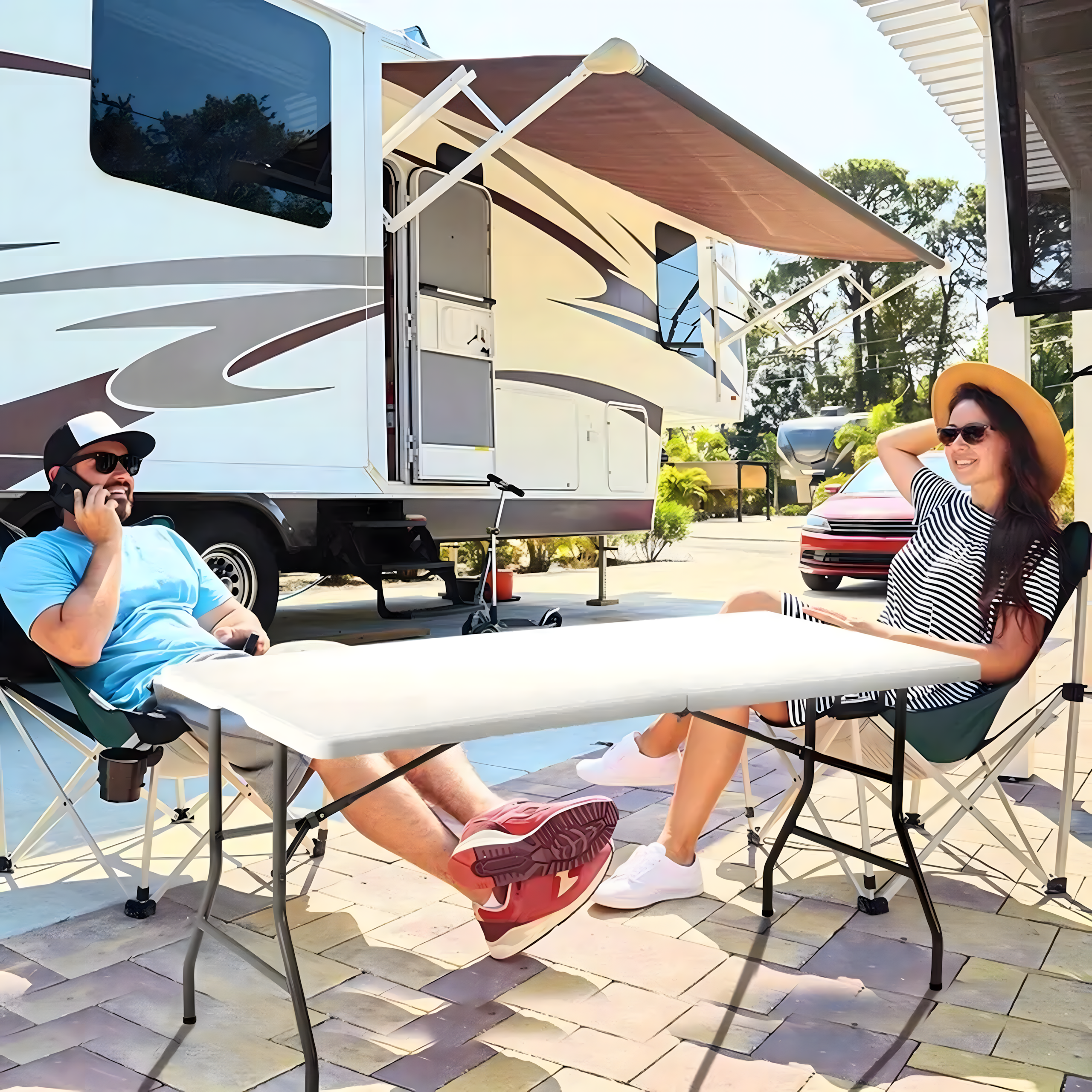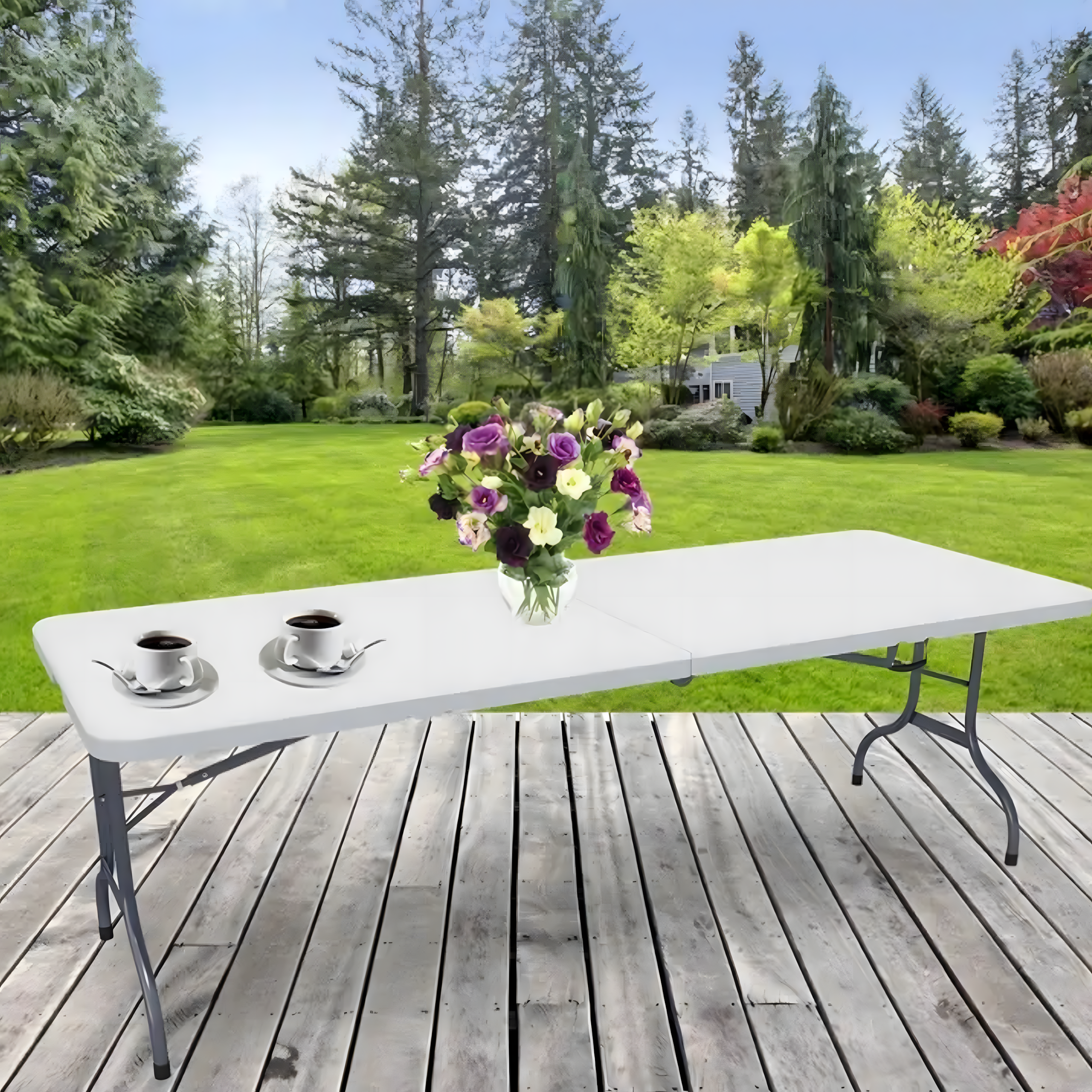 Biały stół składany 180 x 70 x 74 cm jest duży i stabilny. Jego blat wykonano z twardego tworzywa sztucznego, co ułatwia pielęgnację. Składane pod blat nogi są stalowe i mają zabezpieczenie przed złożeniem pod ciężarem jedzenia i napojów. Gdy go nie używasz lub chcesz przewieźć, zamieni się w stół-walizkę. W tej sprytnej konstrukcji nogi modelu ukryte są wewnątrz. Uchwyt pomoże natomiast w komfortowym przenoszeniu.