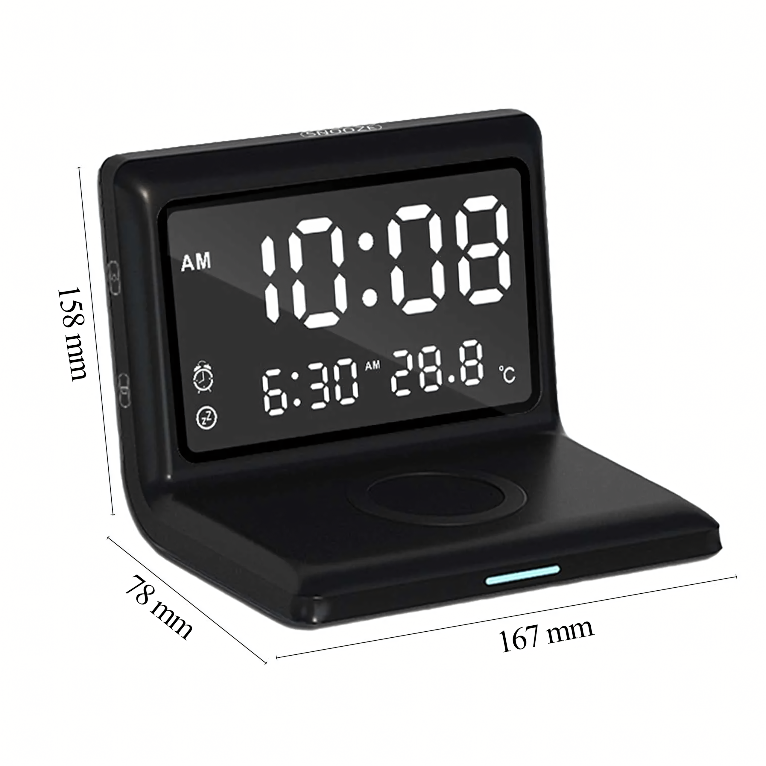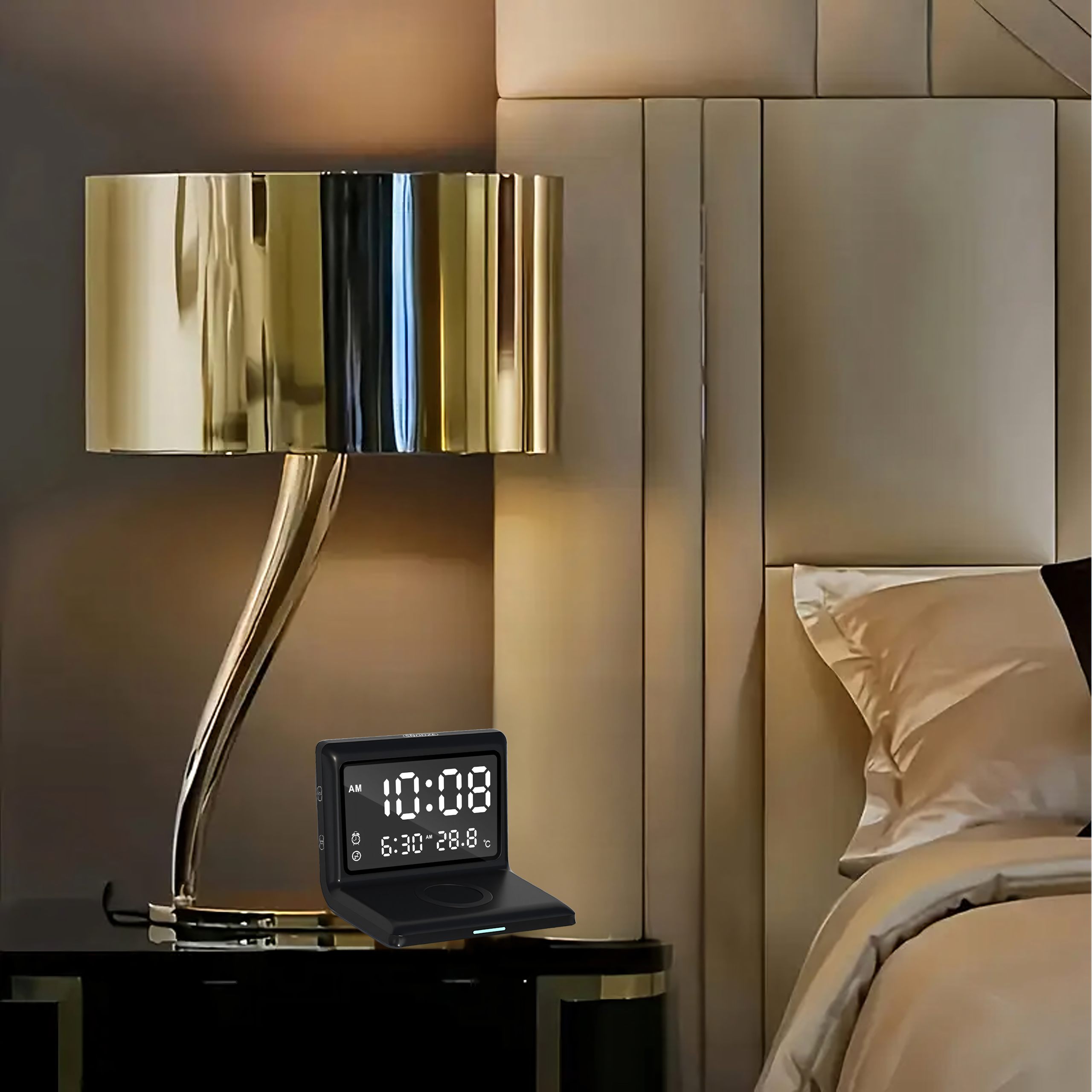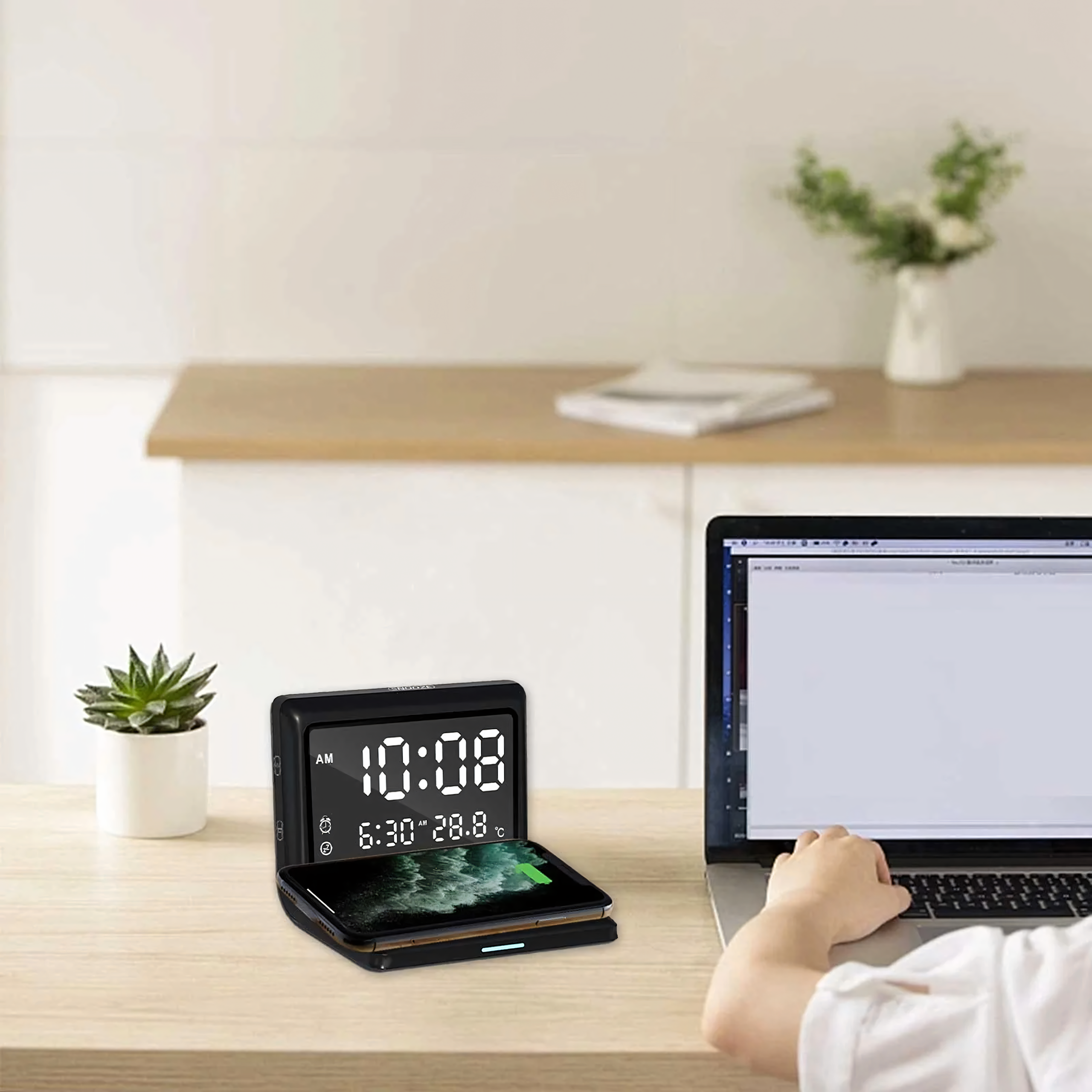 Nowoczesny 3w1 zegar cyfrowy z bezprzewodową ładowarką 15W i termometrem, łączący funkcję budzika, eleganckiego lustra i szybkiego ładowania telefonu – idealny do domu, biura czy hotelu.