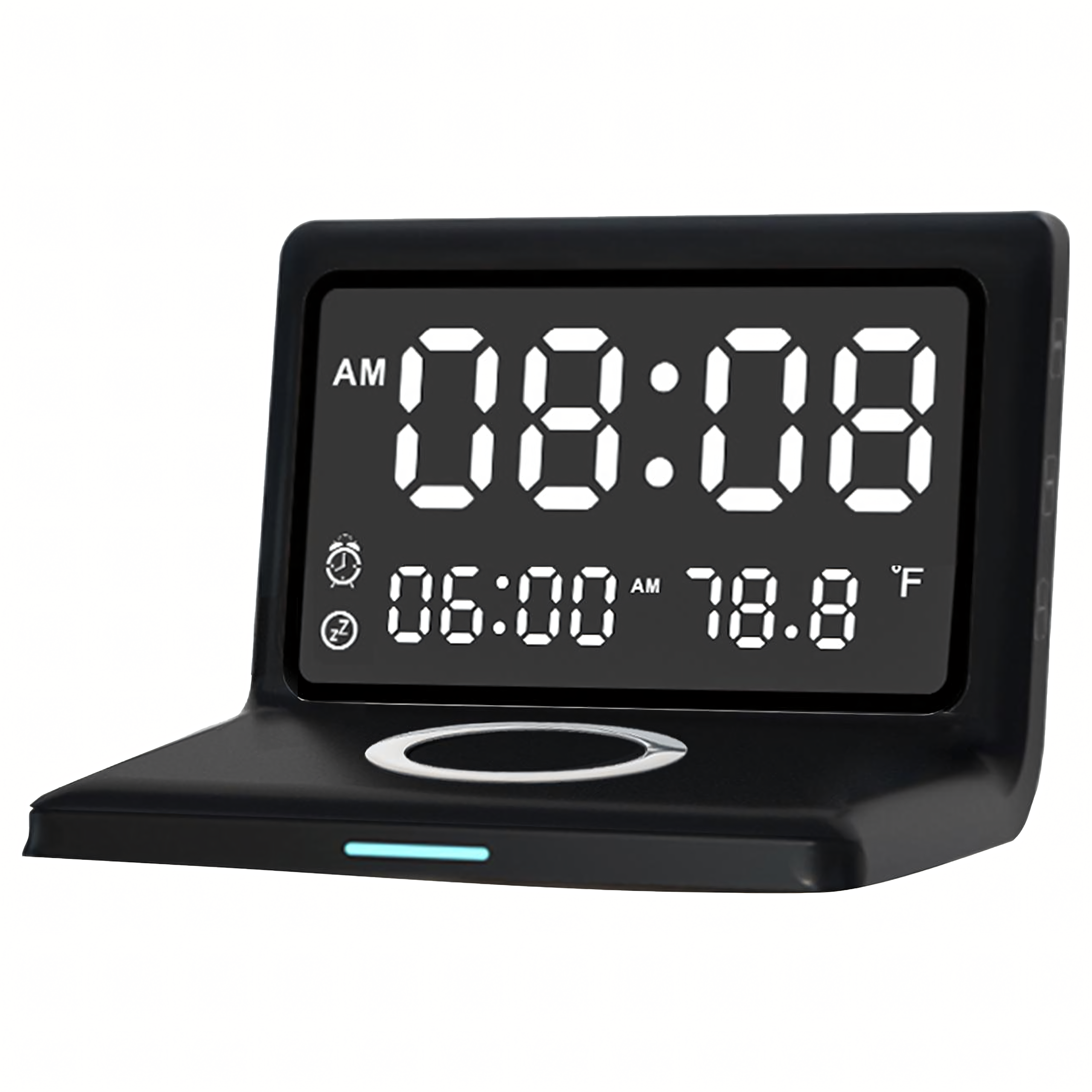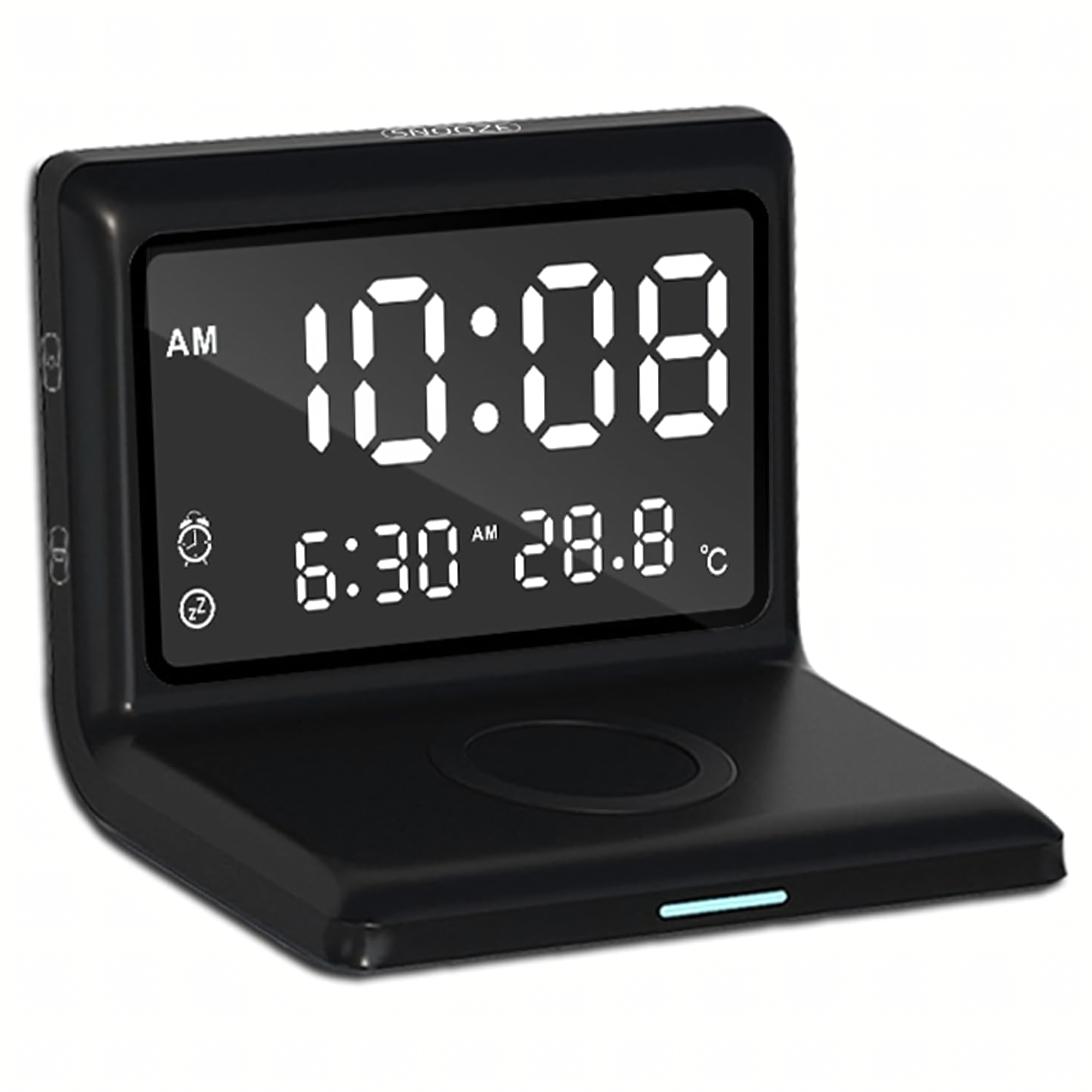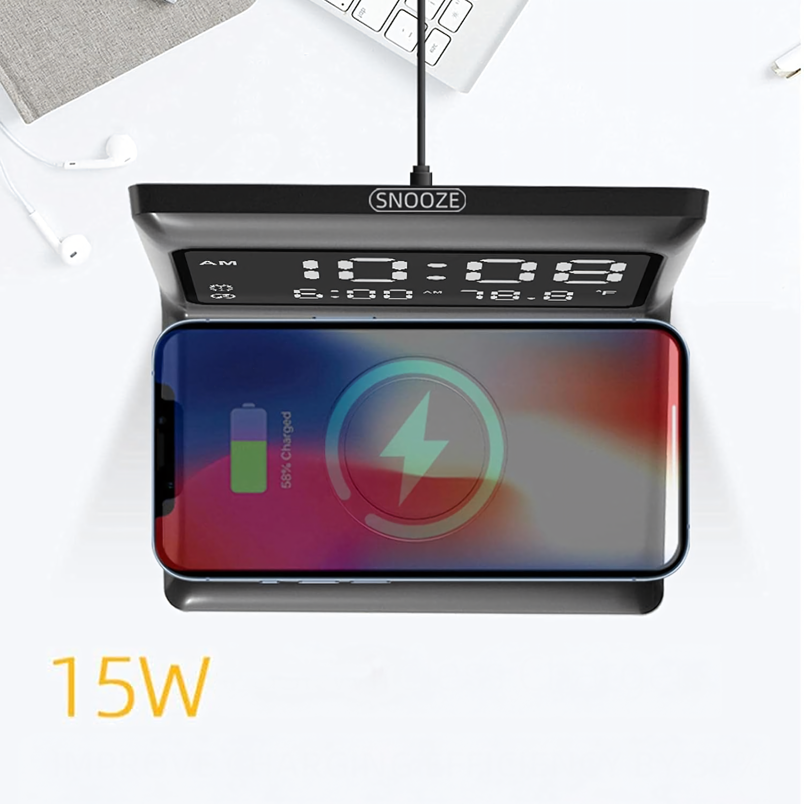 Nowoczesny 3w1 zegar cyfrowy z bezprzewodową ładowarką 15W i termometrem, łączący funkcję budzika, eleganckiego lustra i szybkiego ładowania telefonu – idealny do domu, biura czy hotelu.