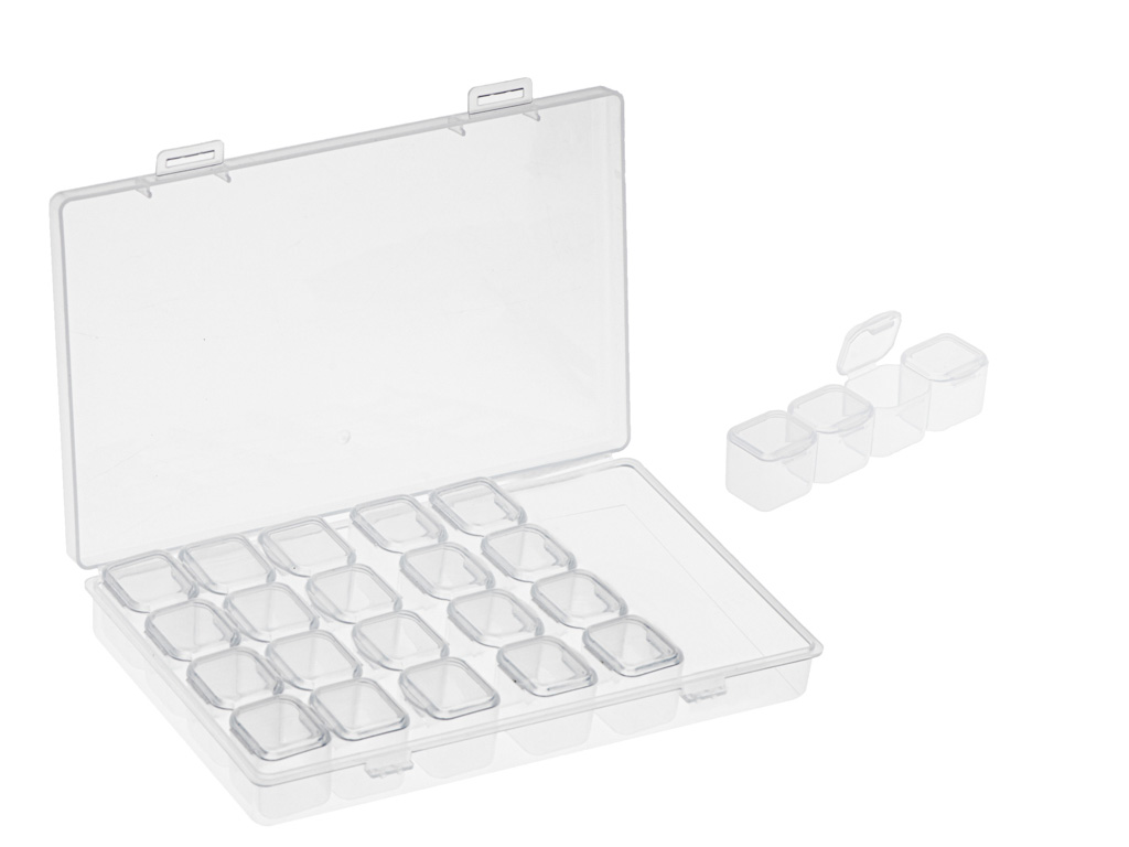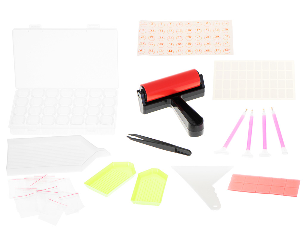 Zestaw akcesoriów do diamond painting. Usprawni układanie obrazków, oraz pomoże w łatwiejszym przechowywaniu diamencików. Ilość elementów: 32. Wym. seperatora do diamentów: 17.5x11x3cm.
