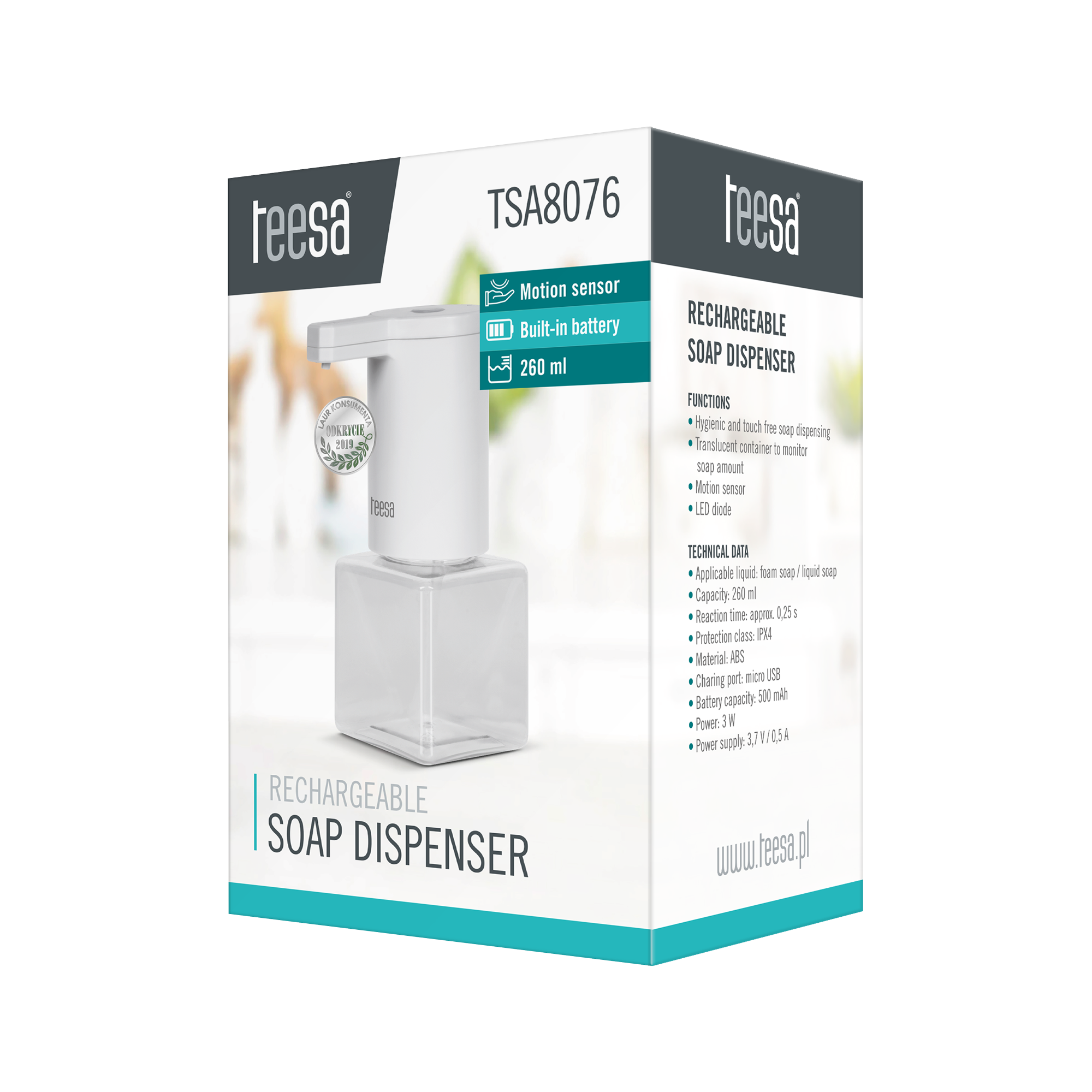 <h2>Automatyczny dozownik mydła Teesa TSA8076</h2><p>Akumulatorowy dozownik do mydła Teesa TSA8076 to doskonały dodatek do łazienki, kuchni oraz innych miejsc, gdzie konieczne jest częste mycie rąk. Urządzenie zapewnia higienę oraz dużą wygodę użytkowania, a piana, którą wytwarza jest nie tylko skuteczna, ale także bardziej ekonomiczna, ponieważ wymaga mniejszej ilości mydła.</p>