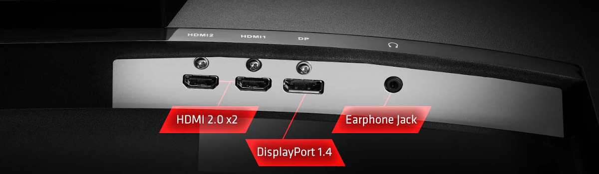 Port Display Port 1.2 obsługuje częstotliwość odświeżania do 165 Hz. Dostępne są dwa dodatkowe porty HDMI 2.0. Ponadto monitor ma dwa wbudowane głośniki i jedno wyjście słuchawkowe 3,5 mm. Podstawka posiada miejsce na przełożenie kabli w celu ich uporządkowania, dodatkowo w zestawie znajduje się opaska na kable.