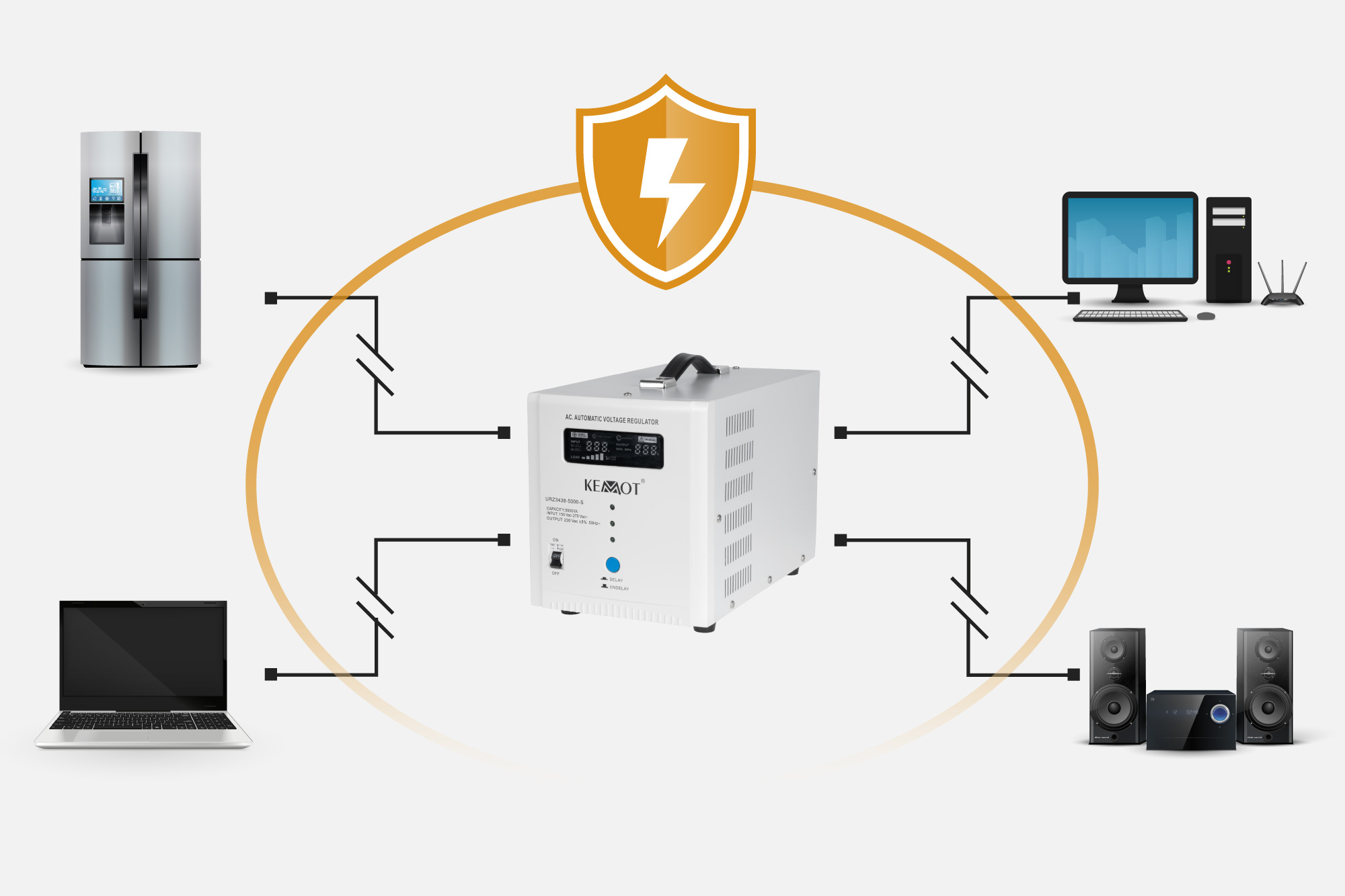 <h2>Zabezpiecz swoje urządzenia przed skokami napięcia</h2><p>Niezależnie od obciążenia sieci i wahań napięcia wyjściowego, stabilizator KEMOT SER-5000-S utrzymuje je na poziomie 230 V ±8%, pozwalając na wydajną pracę wszystkich urządzeń, w tym tych wrażliwych na jakość napięcia sieci. Regulacja odbywa się automatycznie, co zapewnia wysoką dokładność napięcia wyjściowego. KEMOT SER-5000-S znajdzie zastosowanie w warunkach domowych, jak i biurowych, idealnie sprawdzając się do telewizorów i sprzętu RTV, a także kolumn głośnikowych, miniwież i innych urządzeń audio/video, czy komputerów.</p>