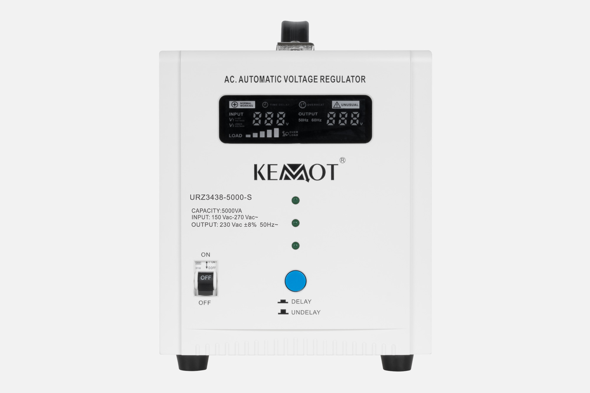 <h2>Funkcja opóźnienia DELAY</h2><p>Jeśli potrzebujesz stabilizatora napięcia do urządzeń posiadających duży chwilowy prąd rozruchowy wybierz model wyposażony w funkcję opóźnienia załączenia DELAY. KEMOT SER-5000-S, został wyposażony w przycisk opóźnienia załączania DELAY w zakresie od 6 do 180 sekund, co obniży ryzyko jego uszkodzenia, gdy podłączone do niego urządzenia mają duży chwilowy prąd rozruchowy. Ponadto stabilizator SER-5000-S posiada zabezpieczenia przed zbyt wysokim i niskim napięciem, przeciążeniem, przegrzaniem i zwarciem.</p>