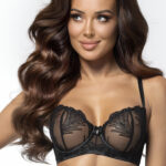 Miękki koronkowy półgorset w głębokiej płonącej czerwieni z ozdabiającym florystycznym haftem i falującymi zdobieniami otula biust nadając mu wyrazistej i soczystej formy. Tył wykonany z siatki pasków połączonych jednym dużym zapięciem oraz połączony regulowanymi ramiączkami w kształcie litery v. Niezwykłe sexy styl dopełniają brazylijskie stringi ozdobione bogatym haftem łączonym z koronką.