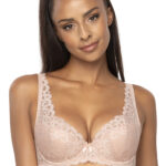 Urzekający swą finezją i elegancją biustonosz Gaila to model z usztywnianymi miseczkami, który nadaje biustowi naturalny, ponętny kształt. Miseczki biustonosza wykonane z delikatnej, lekko połyskującej koronki. Zdobienia miseczek w postaci cienkich paseczków dodają pazura modelowi Gaila. Plecy z elastycznej siateczki. Innowacyjne połączenie tkanin nadaje modelowi elastyczności i lekkości. Pomiędzy miskami biżuteryjna zawieszka, która pięknie rozświetla bieliznę. Model posiada nieodpinane, regulowane ramiączka. Haftka dwurzędowa z trójstopniową regulacja.