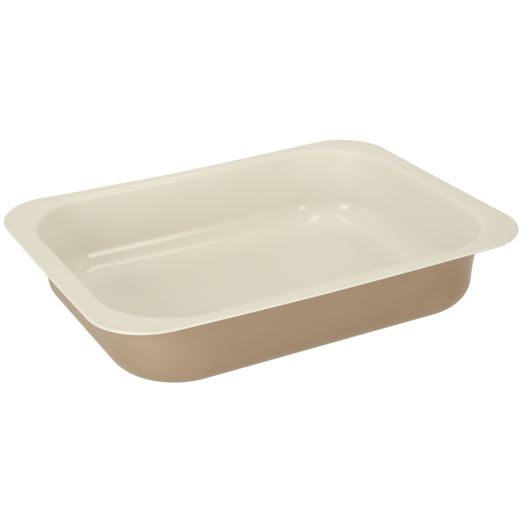Prostokątna blacha o gładkim dnie i zaokrąglonych brzegach – doskonała do słodkich i wytrawnych wypieków. Do użytkowania w piekarnikach gazowych i elektrycznych. Kolor: brązowo-kremowy. Tworzywo: stal z powłoką antyadhezyjną. Wymiary: 29 x 22 x 6 cm.