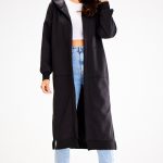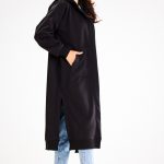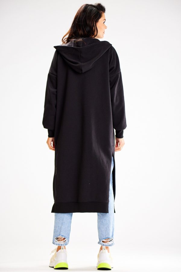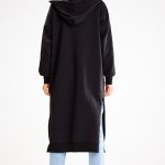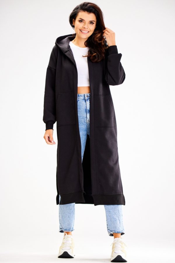 Długa, luźna bluza bez zapięcia, z rozcięciami na bokach, kapturem oraz kieszeniami na przodzie przodu.