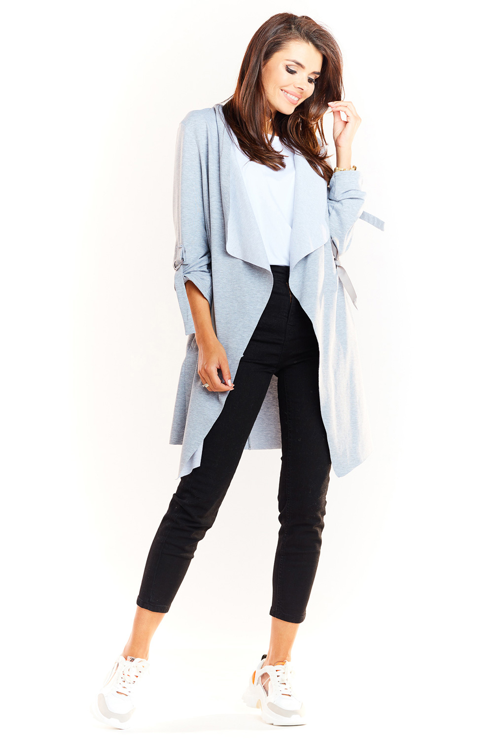 Dzianinowa bluza typu trencz. Wykonana z dzianiny dresowej. Bluza luźno przylega do ciała. Ozdobny sznurek w talii pozwalający dopasować do figury. Załóż koszulkę, dżinsy i stwórz modny, ponadczasowy look.