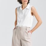 Lekka i elegancka bluzka o regularnym kroju, wykonana z przyjemnego wiskozowego materiału. Dekolt w kształcie litery V subtelnie podkreśla szyję, dodając całości kobiecego charakteru. Bezrękawowy fason zapewnia swobodę i komfort noszenia, a wykończenie dekoltu oraz ramion delikatną pliską nadaje bluzce stylowego wyrazu. Model wkładany przez głowę, doskonały zarówno do codziennych, jak i bardziej eleganckich stylizacji.