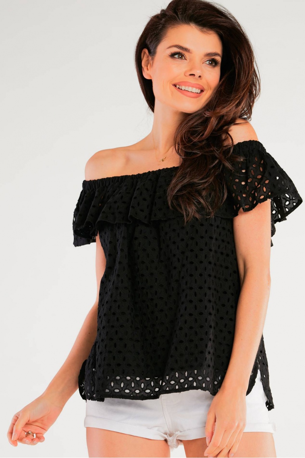 Luźna ażurowa bluzka typu hiszpanka, z falbanką na dekolcie i ramionach. Materiał zapewnia swobodę ruchu i jest niezwykle przyjemny w dotyku. Model idealny do letnich stylizacji. Produkt zaprojektowany i wyprodukowany w Polsce.