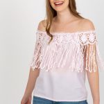 Letnia bluzka z dekoltem w stylu hiszpańskim. Bluzka obszyta ozdobną koronką z frędzelkami.