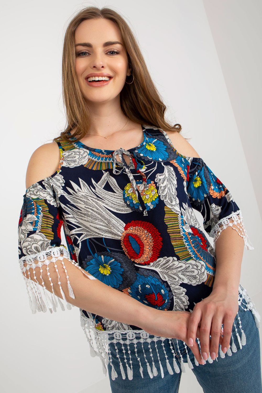 Letnia bluzka z materiału z nadrukiem z rękawem 3/4 oraz okrągłym dekoltem. Bluzka z wiązaniem przy dekolcie oraz ozdobnymi frędzlami.
