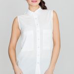 Koszula z delikatnej tkaniny. Klasyczny kołnierzyk, bez rękawów zapinana na błyszczące perełki. Duże nakładane kieszenie na linii biustu. Tył z delikatnym rozcięciem i wiązanym supłem na dole. Szyk w nowoczesnym wydaniu.