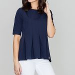 Lekko oversizeowa forma pozwala tuszować niedoskonałości figury. Linia z delikatnie dłuższym tyłem, krótkie rękawy wykończone mankietem. Dekolt okrągły, blisko szyi, zapinana z tyłu na kryty suwak. Z przodu kontrafałdy.