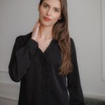 Czarna klasyczna prosta koszula z dekoltem w serek, na całej długości falbanka. Długi rękaw z marszczonym mankietem. Zapinana z przodu na guziki.