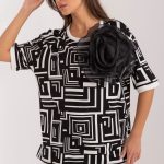 Bluzka z krótkimi rękawkami w formie bufek oraz okrągłym dekoltem. Na przodzie biżuteryjna ozdoba.