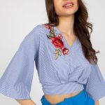 Stylowa bluzka damska wykonana z dominującej, naturalnej bawełny, zapewniającej komfort noszenia i przewiewność. Model o krótkiej długości, idealnie komponujący się z jeansami, spódnicami czy spodniami z wysokim stanem. Bluzka posiada rękawy o długości 3/4 oraz kobiecy dekolt w serek, który subtelnie podkreśla linię szyi. Drobne paski nadają całości lekkości i świeżości, a wyjątkowy detal, wiązanie na plecach dodaje bluzce niebanalnego charakteru. Na przodzie umieszczona została naszywka w formie kwiatów i liści, która wprowadza subtelny, roślinny akcent i podkreśla delikatny, kobiecy styl. To idealna propozycja na cieplejsze dni, zarówno na co dzień, jak i na bardziej wyjątkowe okazje.