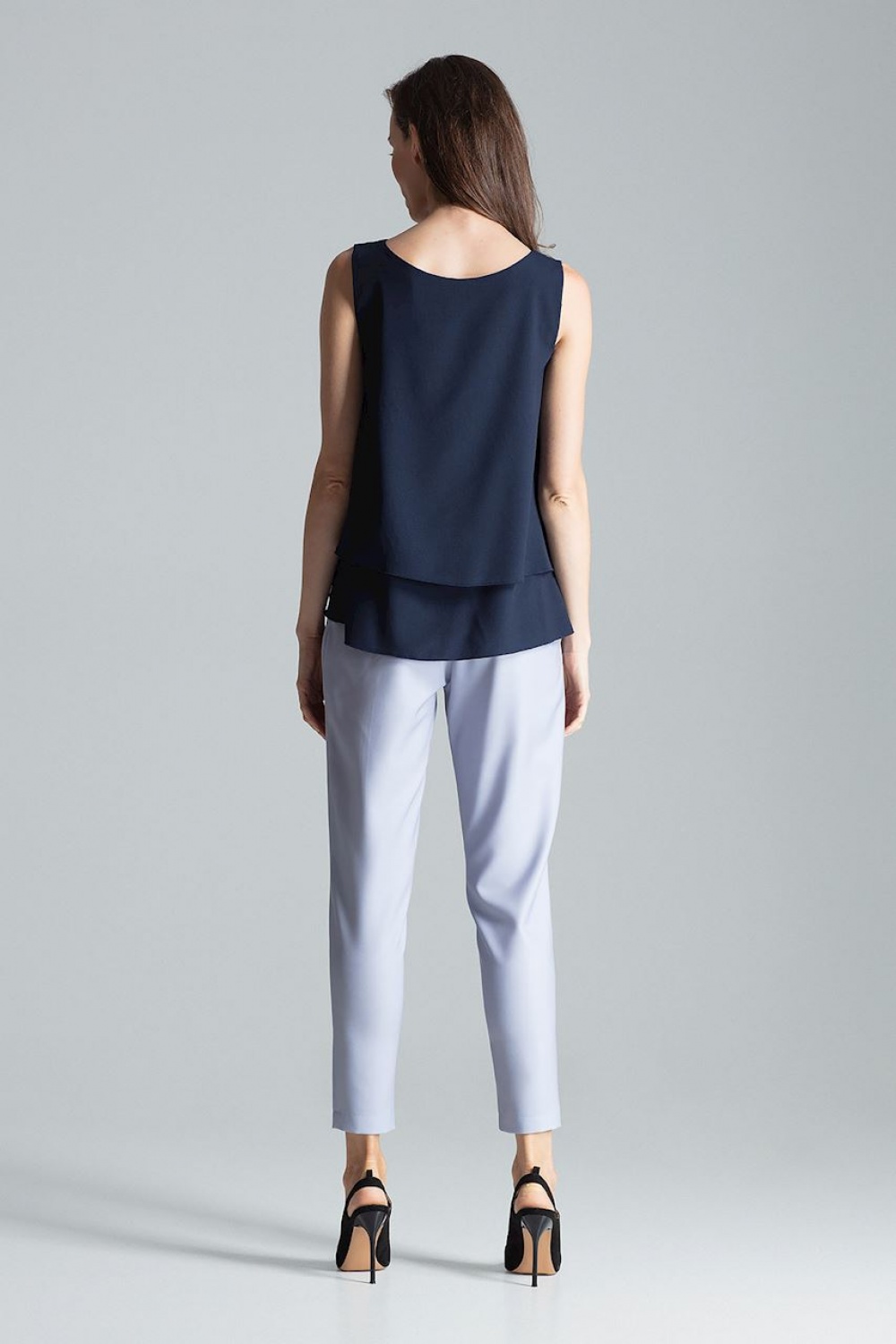 Granatowa urocza, dwuwarstwowa bluzka bez rękawów, z półokrągłym dekoltem, rozkloszowana do dołu.