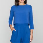 Urocza, dwuwarstwowa bluzka we wzory bez rękawów, z półokrągłym dekoltem, rozkloszowana do dołu.