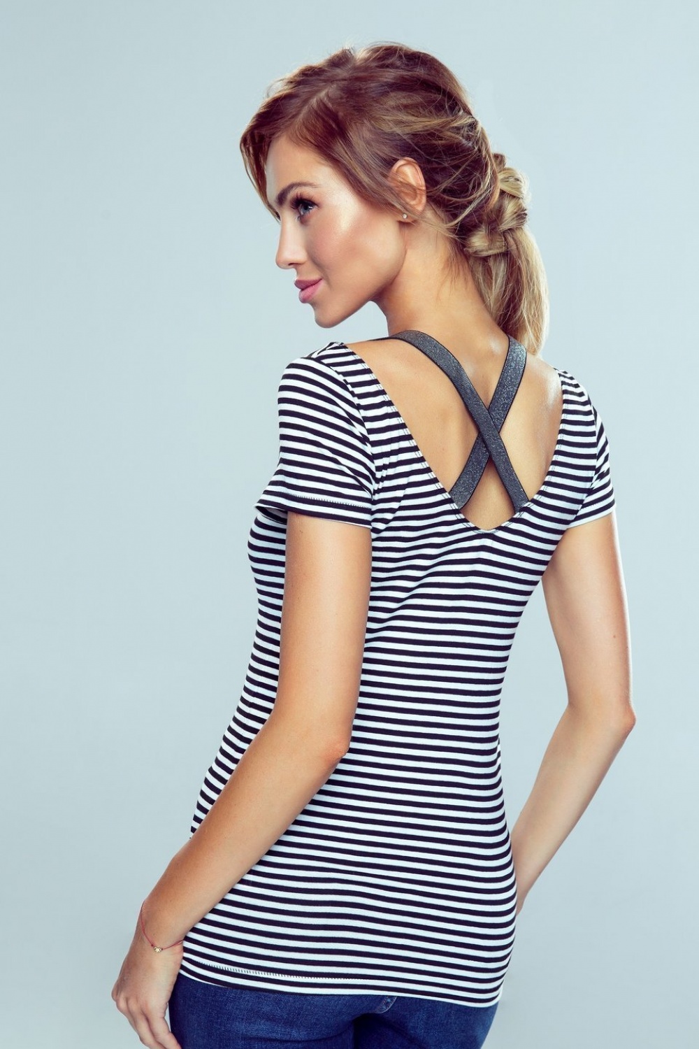 Stylowa bluzeczka zdobiona srebrnymi paskami-gumkami, w formie ozdobnych, błyszczących ramiączek. Idealna do jeansów, inspirowana stylem Glam. Miękka, elastyczna bawełna, w delikatny, biało-czarny prążek.