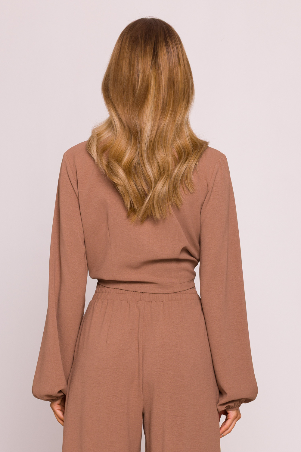 Stylowa bluzka uszyta z lekkiej, krepowej tkaniny o wyraźnej strukturze i matowym wykończeniu. Krótki fason typu crop top, który kończy się w talii, pięknie podkreśla sylwetkę i doskonale komponuje się zarówno z wysokim stanem, jak i warstwowymi stylizacjami. Model wyróżnia się głębokim dekoltem w kształcie litery V, zapinanym na dyskretną napę, z dodatkową możliwością zawiązania przodu, tworząc efekt asymetrycznego, luźnego węzła. Długie, bufiaste rękawy zakończone elastyczną gumką dodają bluzce lekkości i romantycznego charakteru. Zaprojektowano i uszyto w Polsce, z dbałością o detale i komfort noszenia.