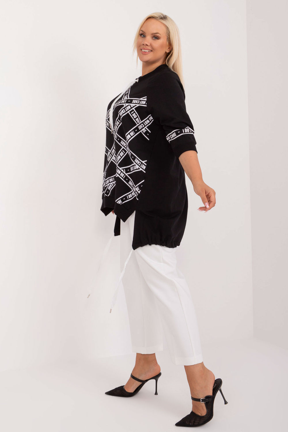 Asymetryczna bluzka plus size to codzienna propozycja o prostym, sukienkowym fasonie, idealna na co dzień. Wykonana z bawełny z dodatkiem elastanu, gwarantuje wygodę i lekkie dopasowanie. Przedłużany krój oraz rękaw 3/4 zapewniają swobodę ruchów oraz komfort. Bluzka ma okrągły dekolt, który dodaje klasycznego wykończenia. Na przodzie znajdują się napisy ozdobione dżetami, co nadaje bluzce modnego i oryginalnego charakteru. Idealna do codziennych stylizacji, zarówno do pracy, jak i na luźniejsze wyjścia.