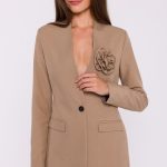 Elegancka bluzka z tkaniny satynowej, zakładana przez głowę, wyposażona w stójkę, która dodaje szyku. Dekolt zdobi subtelne, ozdobne przeszycie, a na piersi znajduje się praktyczna kieszonka. Długie rękawy zakończone są mankietami zapinanymi na jeden guzik, co podkreśla dbałość o detale. Dół bluzki ma półokrągłe wykończenie, z przodem krótszym niż tył, co nadaje jej nowoczesnego i stylowego wyglądu. Bluzka została zaprojektowana i uszyta w Polsce, idealna do eleganckich i casualowych stylizacji.