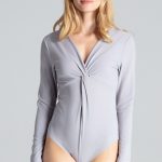Szare zmysłowe body z długim rękawem, z kopertowym dekoltem. Na linii biustu przeszycie z ozdobnym marszczeniem. Model podkreślający biust.