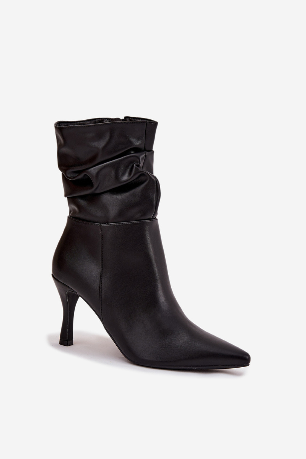 Eleganckie botki damskie z marszczoną cholewką to propozycja pełna kobiecego charakteru. Model ze szpiczastymi noskami i smukłą szpilką podkreśla nogi i dodaje stylu każdej stylizacji. Zamek z boku ułatwia szybkie zakładanie i idealne dopasowanie do stopy, czyniąc botki świetnym wyborem na wieczorne wyjścia i eleganckie okazje.