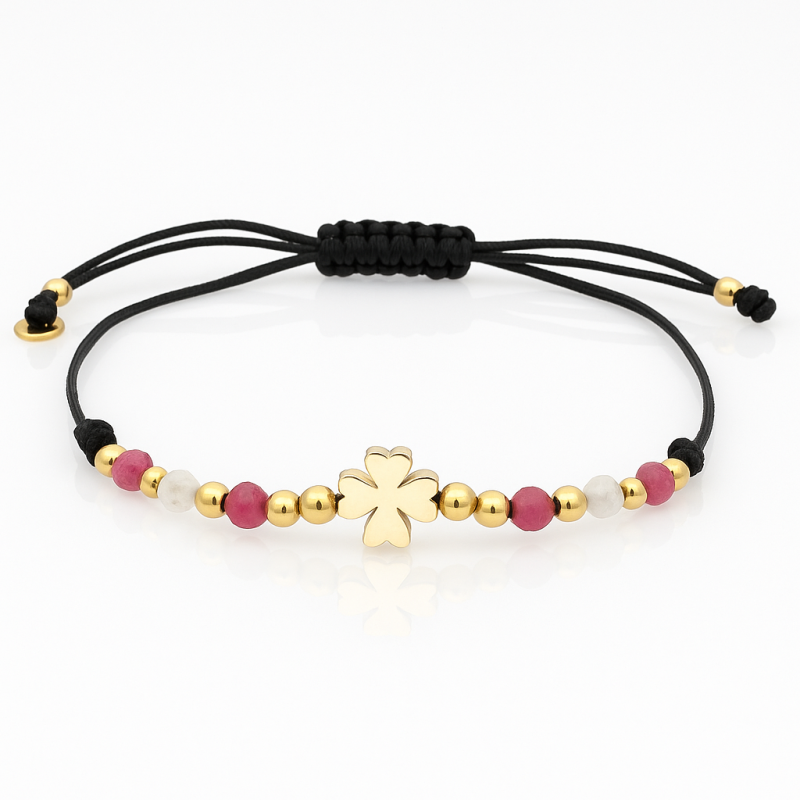 Bransoletka na rękę stal chirurgiczna pozłacana 14k złotem, koniczynka na czarnym sznurku- BST1548