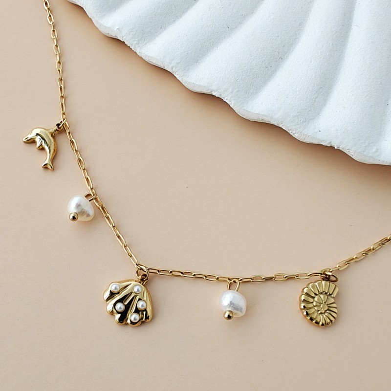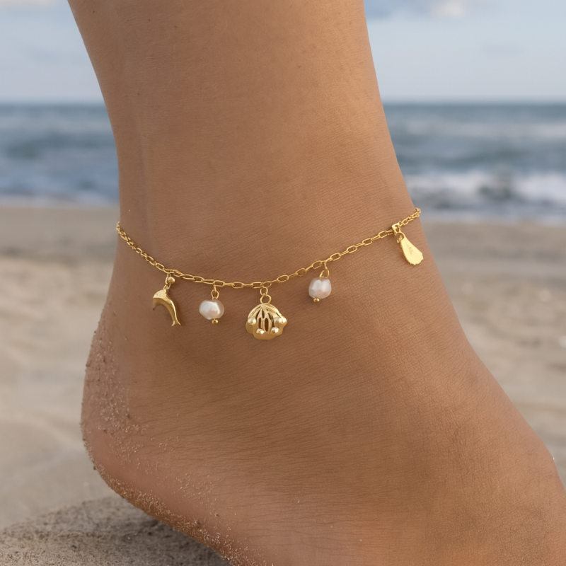 Bransoletka na stopę stal chirurgiczna pozłacana 14k złotem, muszle perły – BST1562