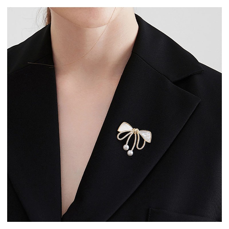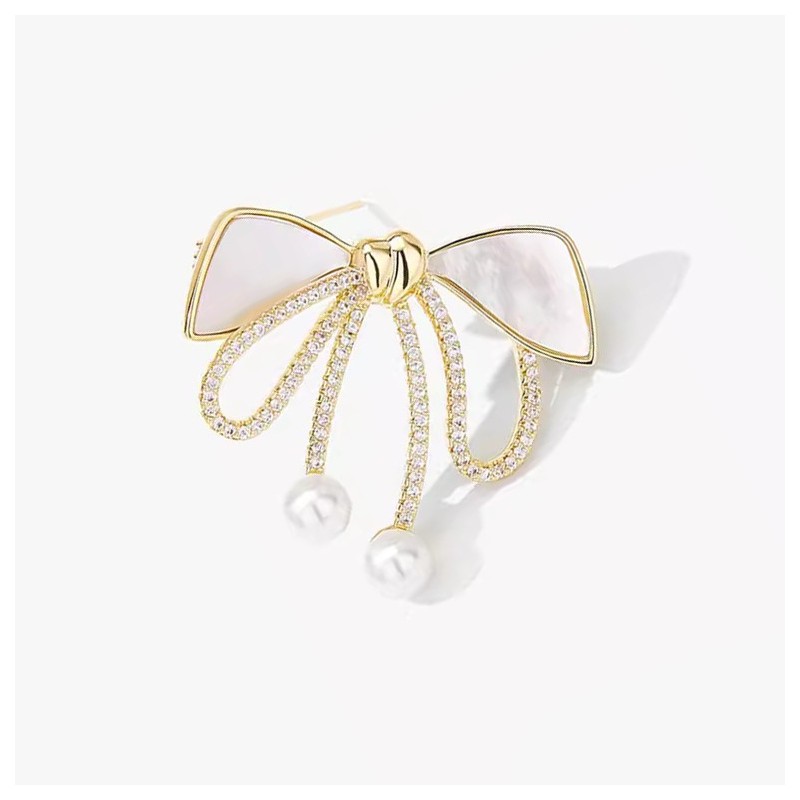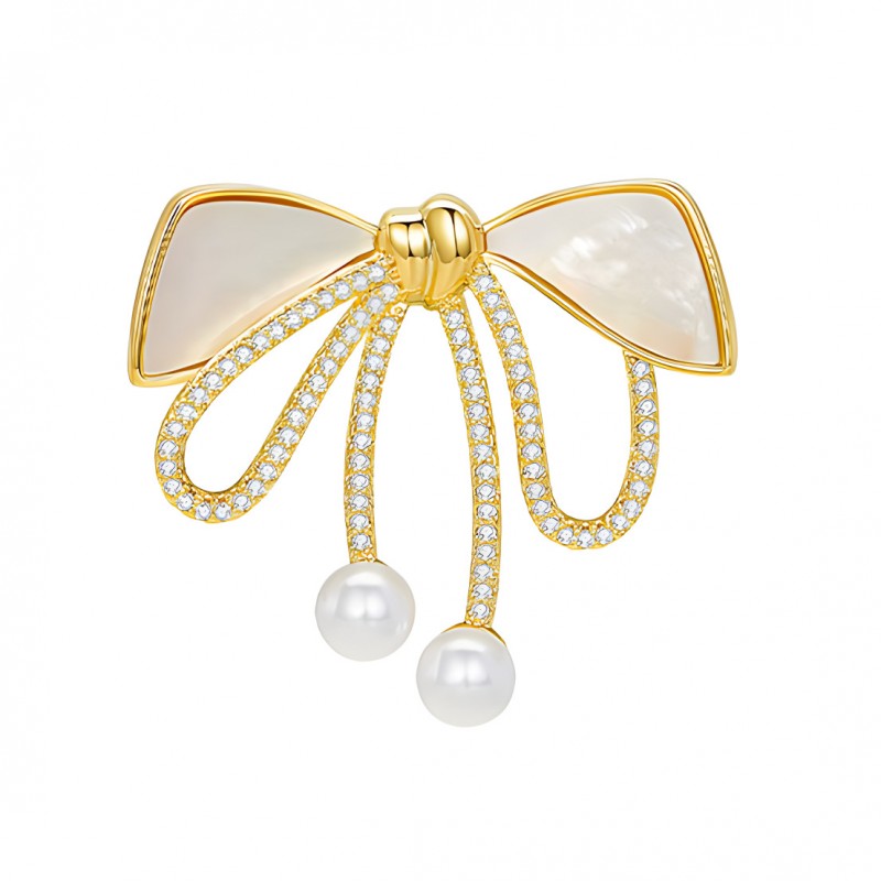 Broszka ozdobna złota KOKARDKA masa perłowa i cyrkonie BZ197