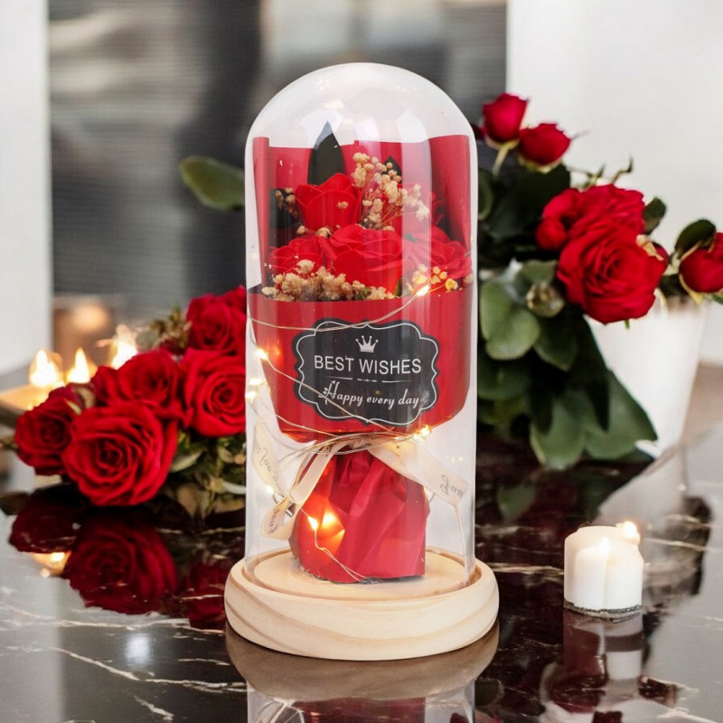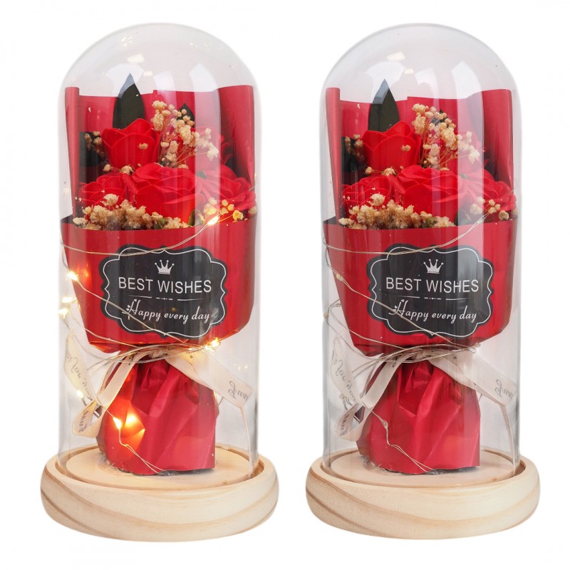 Bukiet kwiatów w szklanej kopule, róże na prezent, świecące LED ROZ19