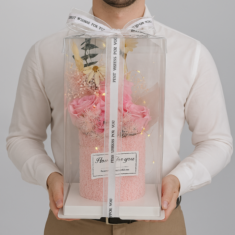 Bukiet zapachowych kwiatów mydlanych w pudełku na prezent, świecące LED BUK21