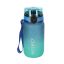 Niebiesko-zielona butelka na wodę o pojemności 600 ml z miarką odmierzającą poziom wypitej wody na godzinę. Smycz pozwala wygodnie trzymać ją w ręku, a zamykana klapa typu „klik” nie rozlewa zawartości. Wymiary: 19 cm x 9 cm