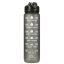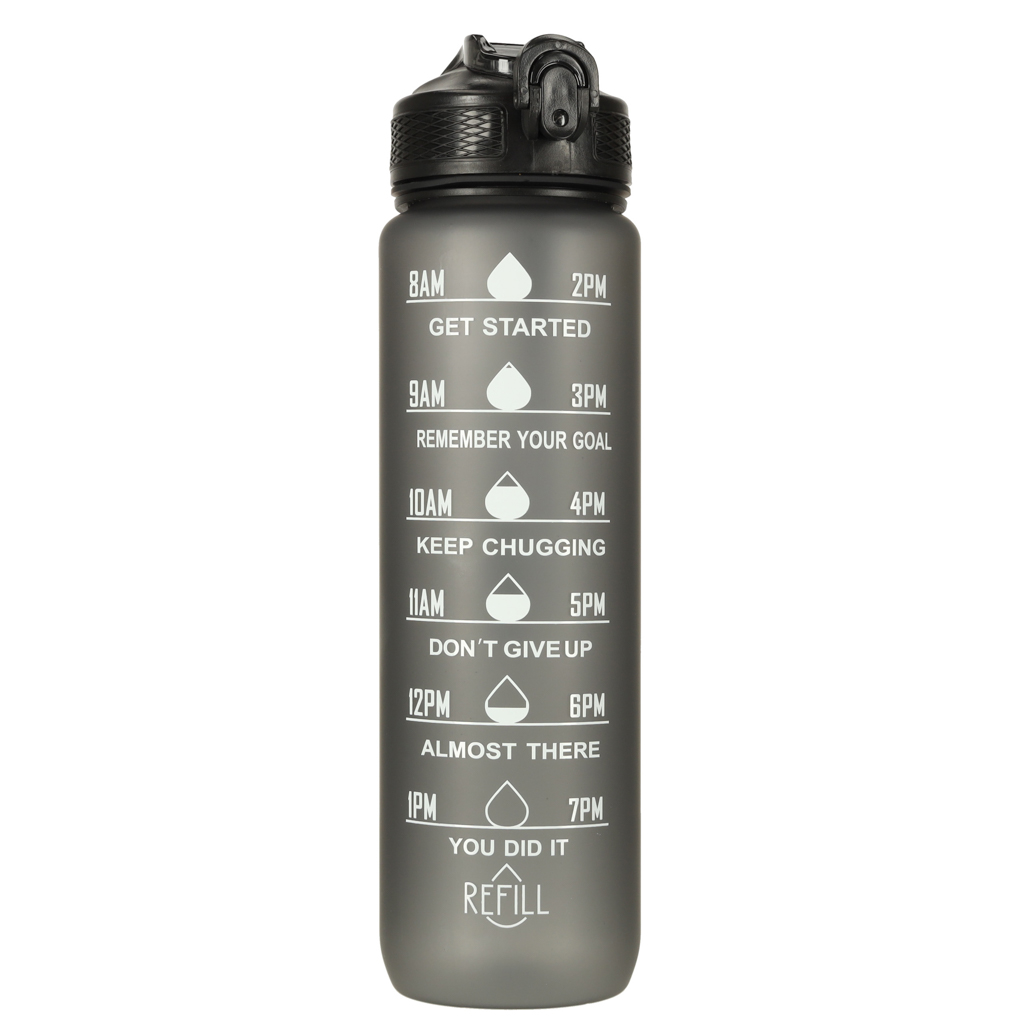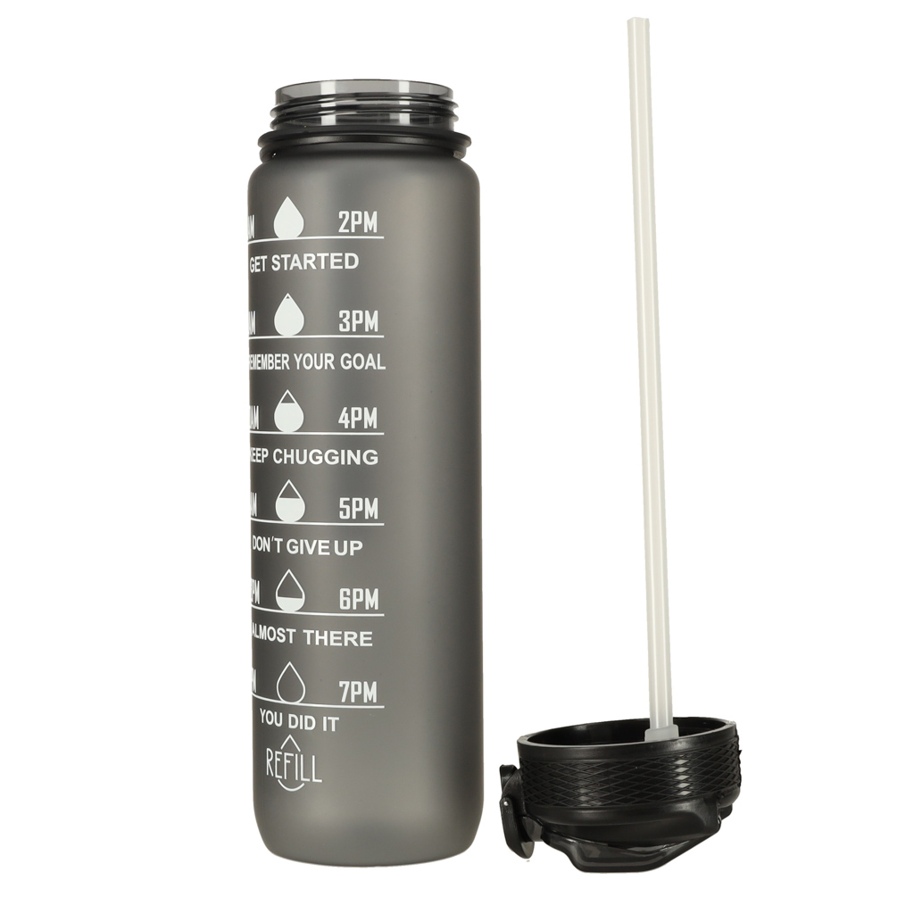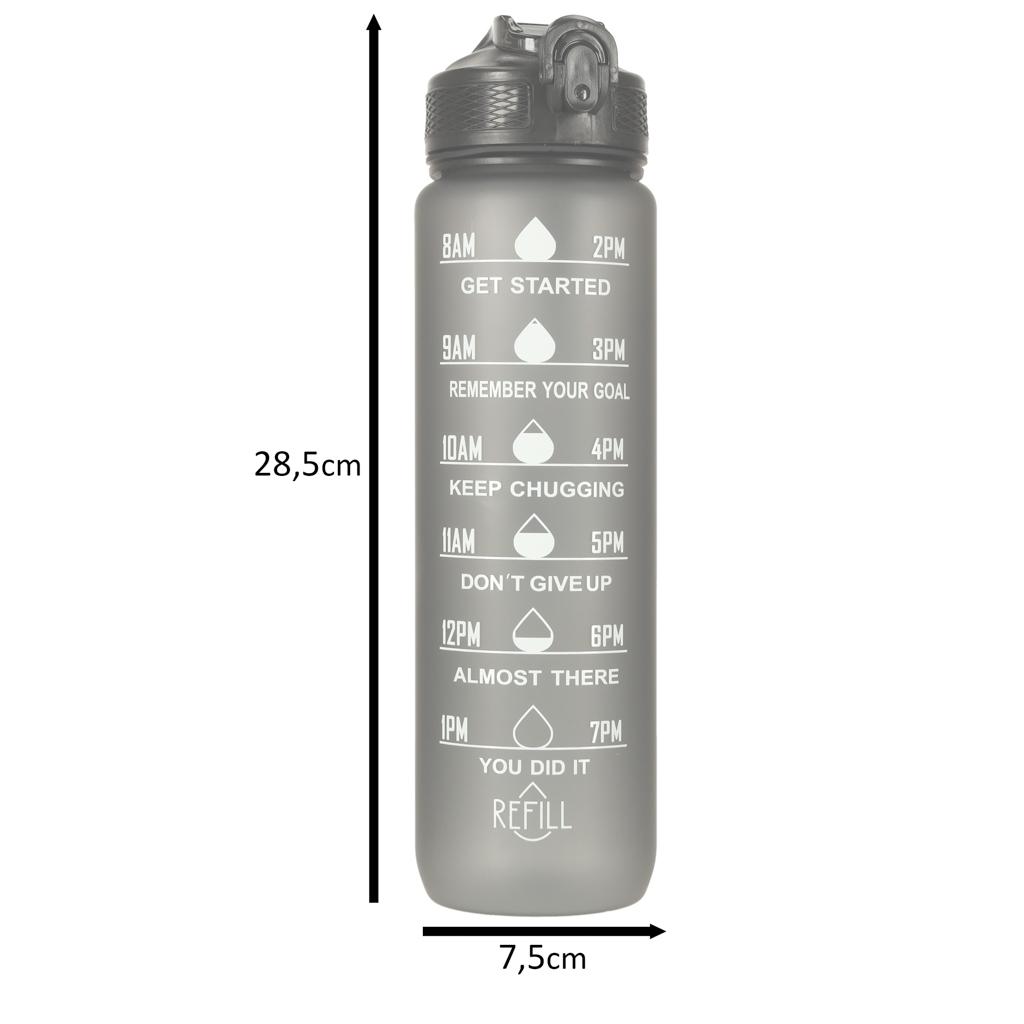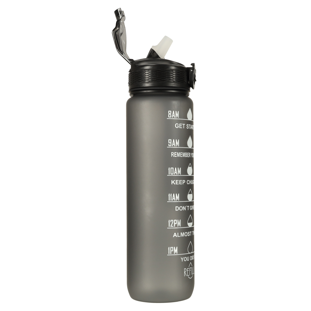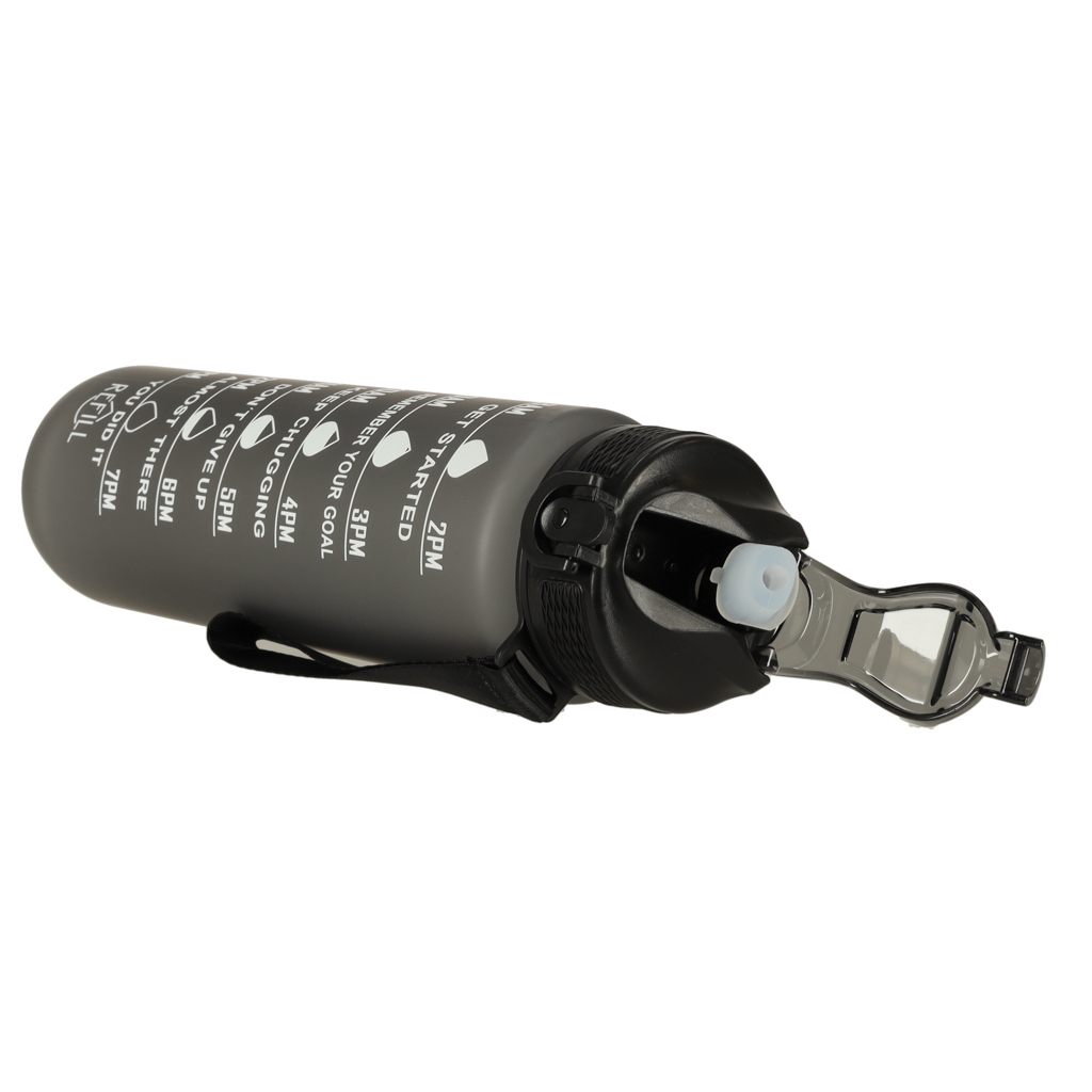 Tritanowa butelka na wodę w czarnym kolorze. Posiada ustnik ze słomką oraz zabezpieczenie przed przypadkowym otwarciem się. Nadrukowana skala z godzinami i hasłami przypomina o regularnym piciu wody. Pojemność: 1 litr. Wymiary: 28,5 cm x 7,5 cm.