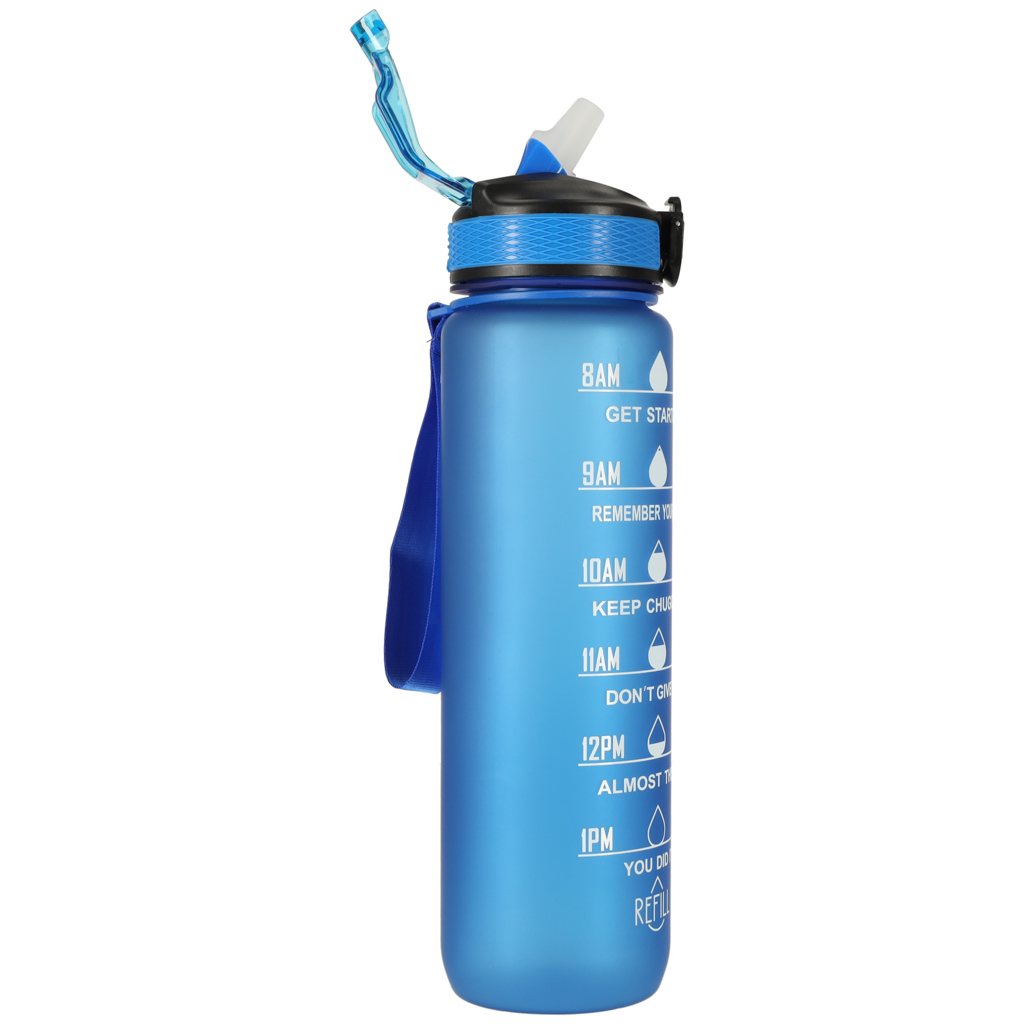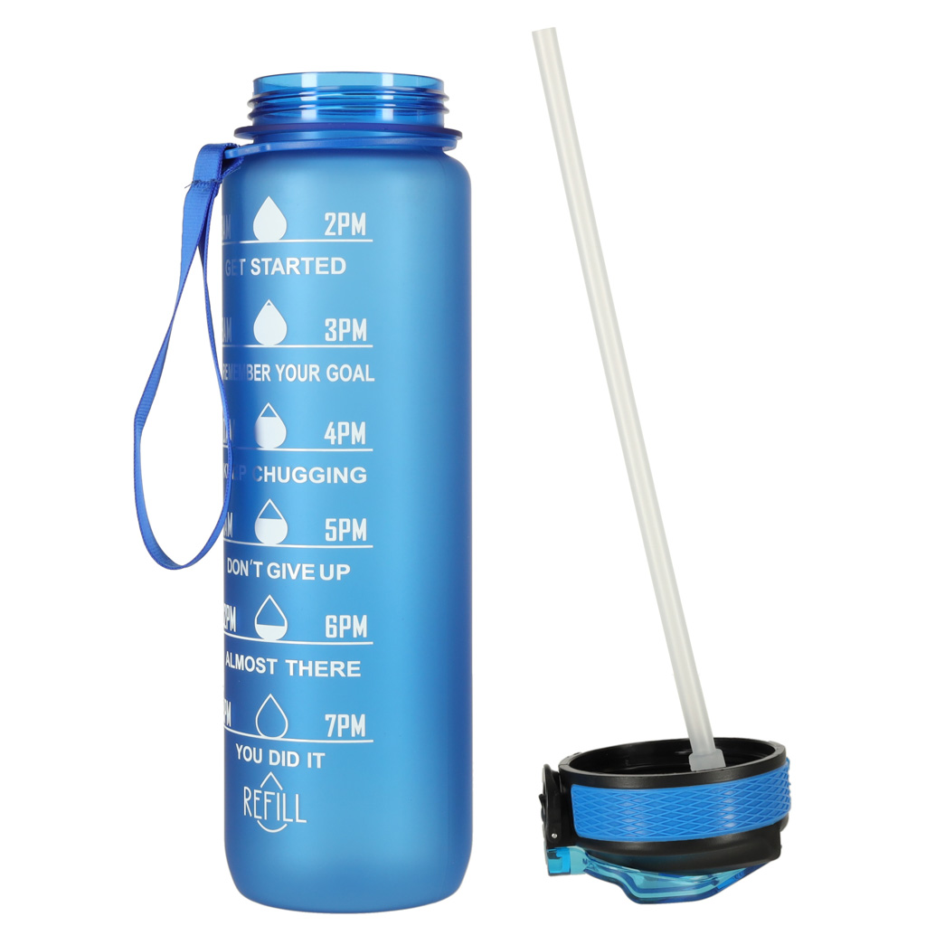 Butelka na wodę bidon ze słomką uchwytem miarką motywacyjną na siłownię BPA free Tritan 1l niebieska