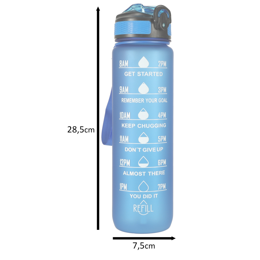 Tritanowa butelka na wodę w niebieskim kolorze. Posiada ustnik ze słomką oraz zabezpieczenie przed przypadkowym otwarciem się. Nadrukowana skala z godzinami i hasłami przypomina o regularnym piciu wody. Pojemność: 1 litr. Wymiary: 28,5 cm x 7,5 cm.