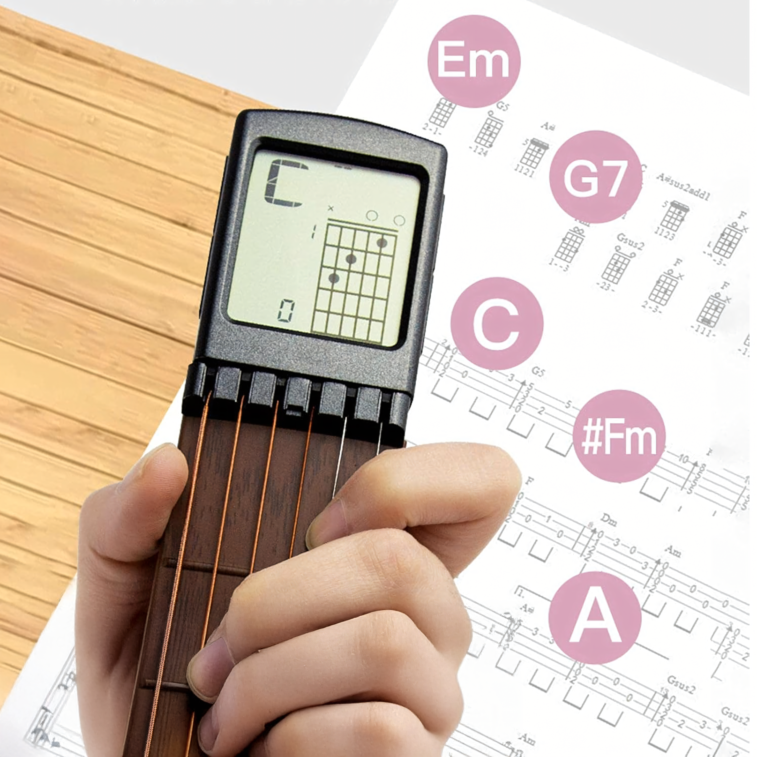 Mały, lekki i przenośny, pozwala ćwiczyć akordy i rozwijać pamięć mięśniową w dowolnym miejscu i czasie. Dzięki obrotowemu ekranowi z podglądem najczęściej używanych akordów, stalowym strunom oraz funkcji metronomu, nauka staje się prostsza i bardziej efektywna.