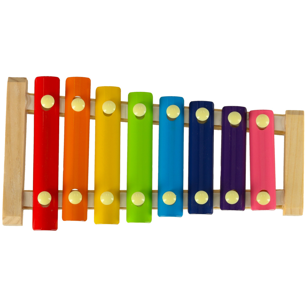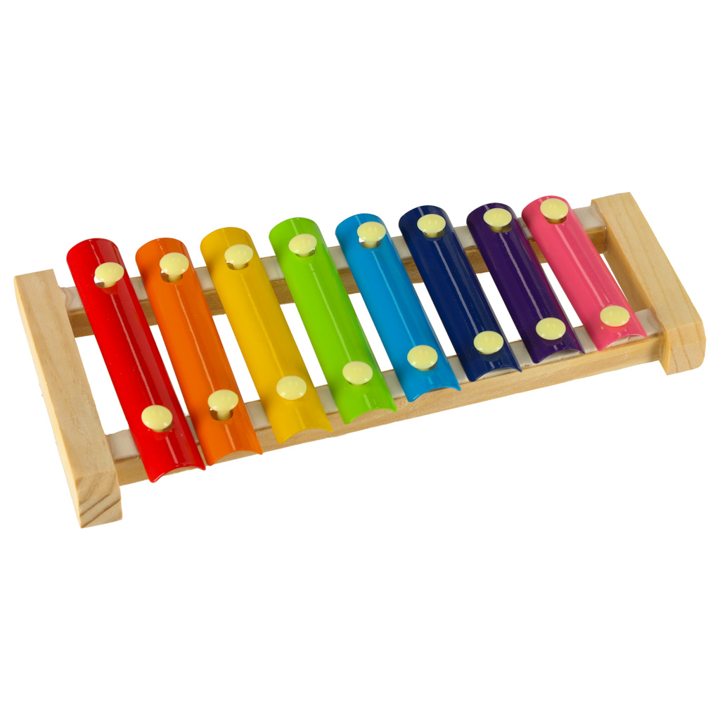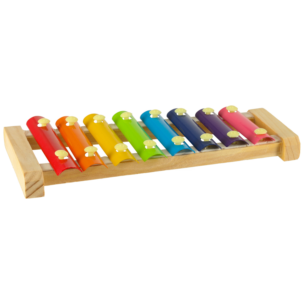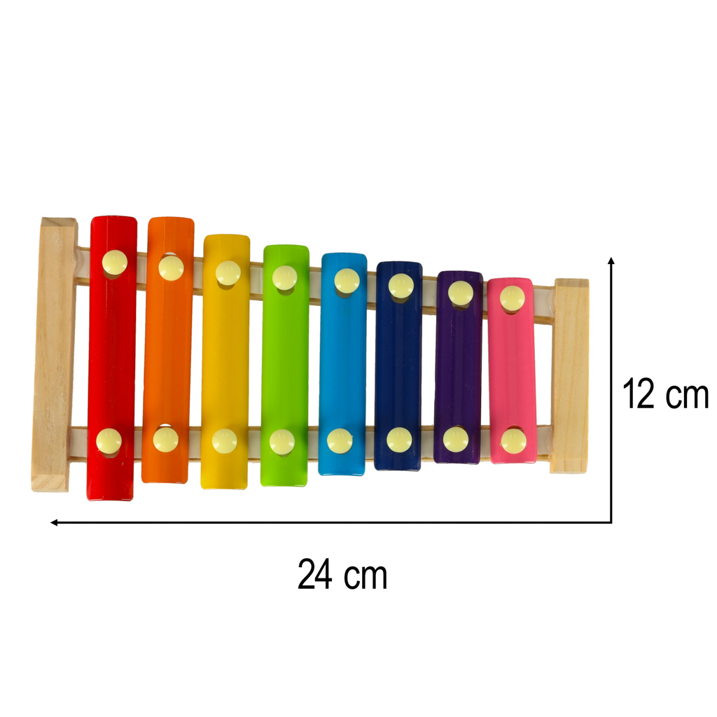 Cymbałki z 8 metalowymi szczebelkami w tęczowych kolorach. Zabawka pobudza kreatywność i twórcze myślenie, a także uczy cierpliwości i poprawia pamięć. W zestawie cymbałki i 2 pałeczki. Tworzywo: drewno. Dł. cymbałek: 20cm. Dł. pałeczek: 16cm.