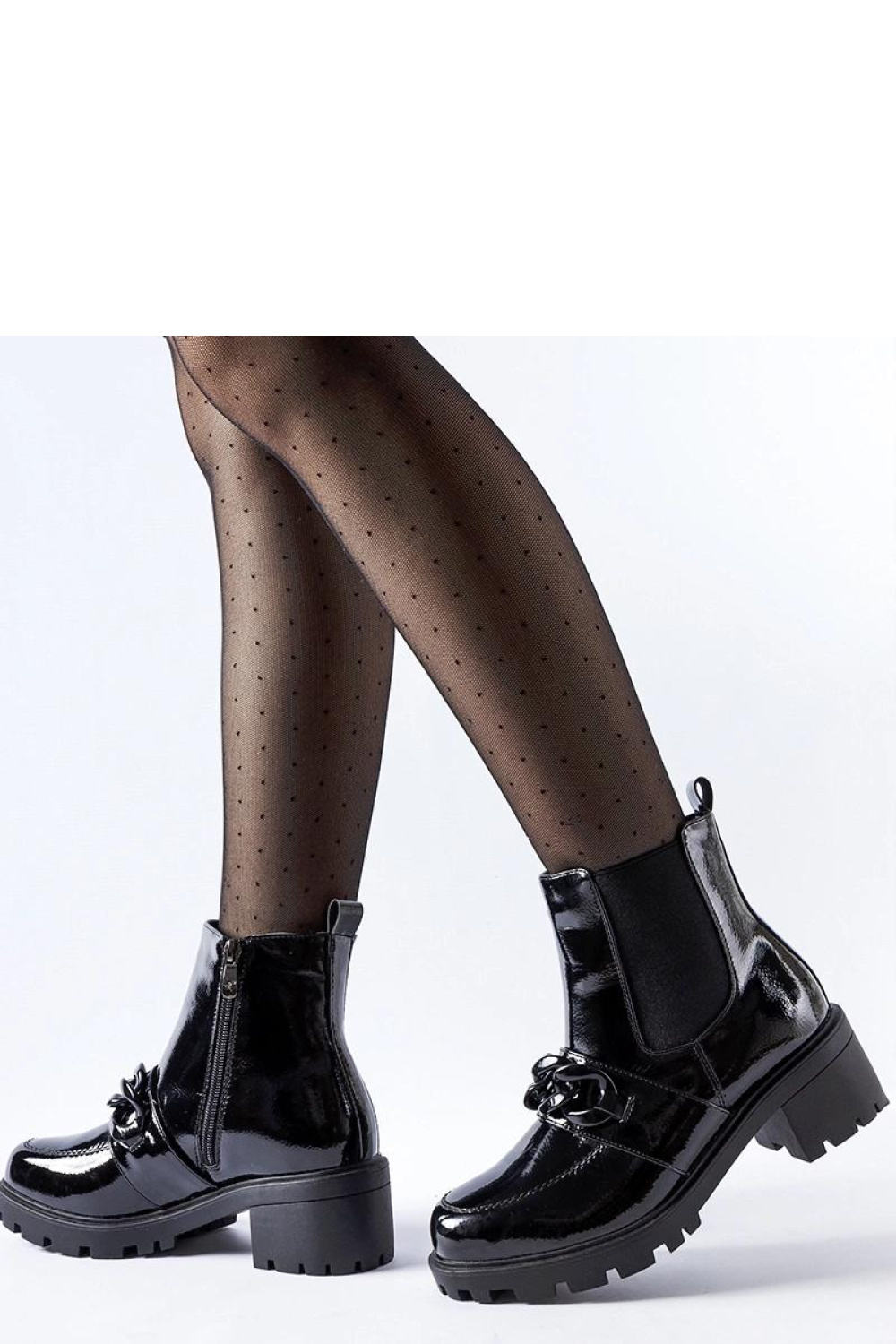 Eleganckie botki w kolorze czarnym, wykonane z lakierowanej skóry, ozdobione metalową klamerką. Idealne na chłodne jesienne i zimowe dni, ponieważ posiadają ocieplenie wewnątrz. Wygodne zapięcie na zamek ułatwia zakładanie i zdejmowanie butów. Solidna gumowa podeszwa zapewnia dobrą przyczepność na różnych rodzajach nawierzchni. Botki z kolekcji Jesień/Zima, które będą doskonałym uzupełnieniem do wielu stylizacji.