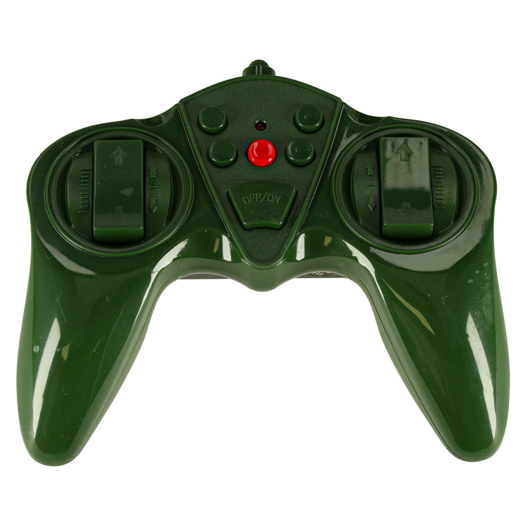 Jazda w każdym kierunku. Dźwięki strzałów i silnika, oświetlenie. Zdalnie obracana wieżyczka. Czołg w 2 kolorach i mogą walczyć na podczerwień. Zasilanie: akumulator Ni-Cd N4,8V 700mAh, bateria 9V. Wymiary: 38x21x15cm.