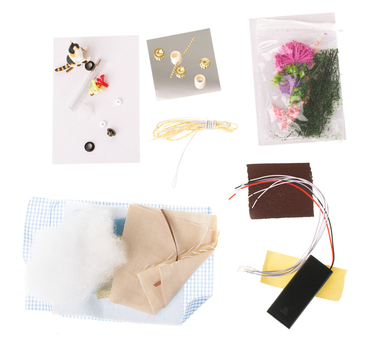 Wieloelementowy, drewniany domek dla lalek w stonowanych kolorach.W pokoiku znajduję się 3 lampki LED zasilane bateriami:2x AAA 1,5V i 3x 1,5VLR54- brak w zestawie.Zestaw zawiera m.in: klej do sklejenia elementów, Wymiary pokoju:12,4×15,02x 10,5 cm