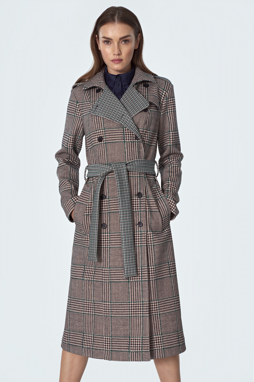 Dwurzędowy płaszcz z paskiem w pepitko PL10 Pepitko – Nife