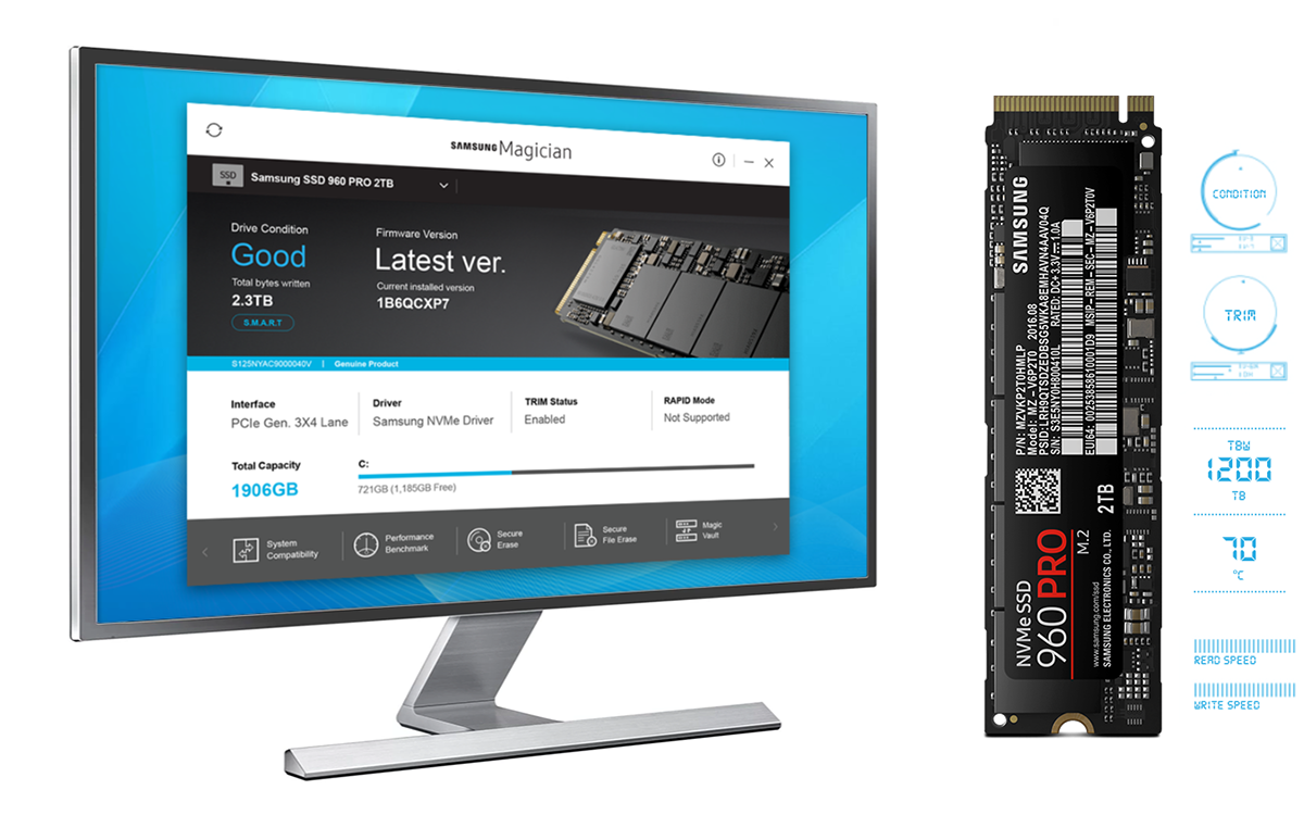 Dysk 960 EVO jest wyposażony w nową wersję zaawansowanego oprogramowania Magician służącego użytkownikom do monitorowania i konserwacji dysku. Magician umożliwia spersonalizowane sprawdzanie oprogramowania firmware oraz dodatkowe funkcje dopasowane do poszczególnych napędów użytkowników. Dokonuje on nawet automatycznych aktualizacji oprogramowania firmware, aby zapewnić odpowiednie działanie dysku.