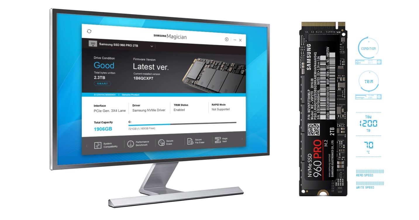 Nowa wersja zaawansowanego oprogramowania Magician służy użytkownikom do monitorowania i konserwacji dysku 960 PRO w sposób, w jaki robią to informatycy. Magician umożliwia spersonalizowane sprawdzanie oprogramowania firmware oraz dodatkowe funkcje dopasowane do poszczególnych napędów użytkowników. Dokonuje on nawet automatycznych aktualizacji oprogramowania firmware, aby zapewnić odpowiednie działanie dysku.z systemem komputerowym użytkownika.