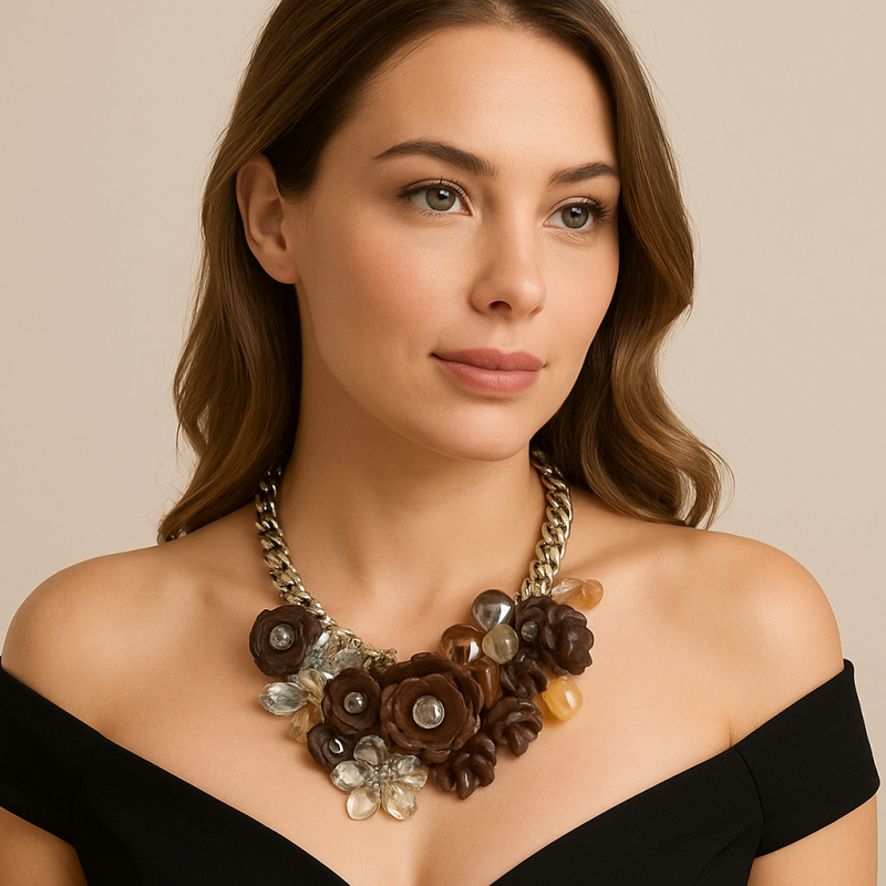 Efektowna Kolia naszyjnik, Kwiaty Szklane brązowe N74BR