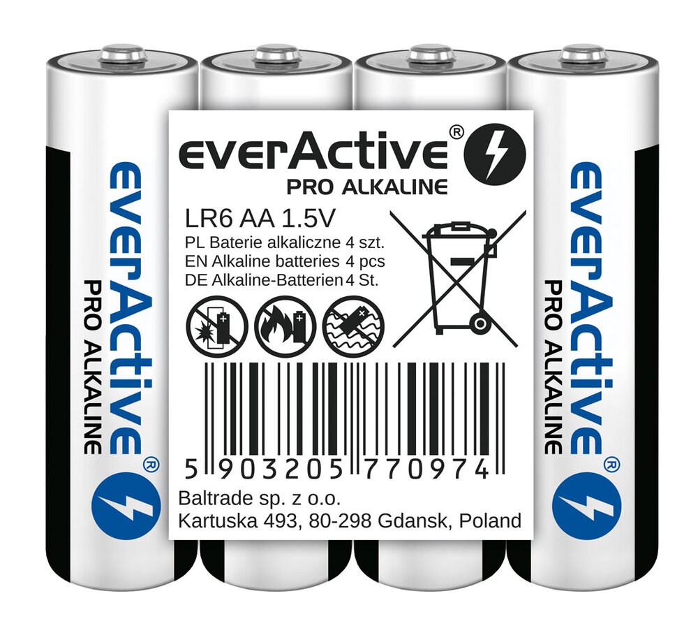 EVERACTIVE BATERIE ALKALICZNE PRO ALKALINE AA, LR6, SHRINK 4 SZT, 1250 MAH, WYSOKA WYDAJNOŚĆ, LR6PRO4T